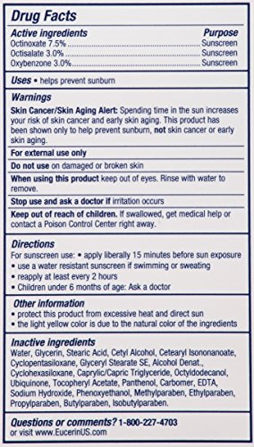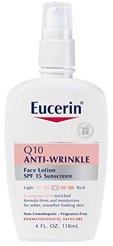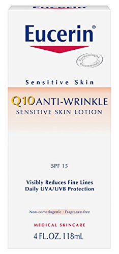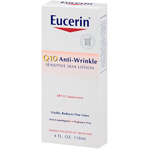 -. Binding : Health and Beauty -. Brand : Eucerin -. EAN : 0072140634216 -. Feature : Reduces the appearance of fine lines and wrinkles in as little as 5 weeks / Firms and moisturizes for softer, smoother skin / Can be used alone or under make-up / Won't irritate dry, sensitive skin / Fragrance-Free, non-comedogenic (won't clog pores), and appropriate for sensitive skin -. Label : Beiersdorf, Inc. -. Manufacturer : Beiersdorf, Inc. -. NumberOfItems : 1 -. PackageQuantity : 1 -. ProductGroup : Pantry -. ProductTypeName : BEAUTY -. Publisher : Beiersdorf, Inc. -. ReleaseDate : 2015-04-30 -. Studio : Beiersdorf, Inc. -. Title : Eucerin Q10 Anti-Wrinkle SPF 15 Sensitive Skin Lotion, 4 Ounce -. UPC : 072140634216