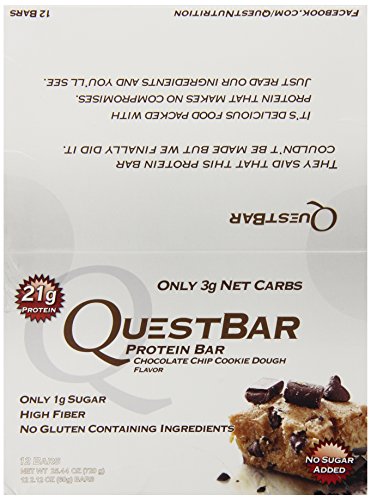 -. Binding : Health and Beauty -. Brand : Quest Nutrition -. ClothingSize : 2-Boxes/24-Bars -. Color : Multi-Colored -. Department : unisex-adult -. EAN : 0799599407726 -. Feature : Each bar is made with insanely delicious ingredients that promote a healthy lifestyle / High fiber! Each bar provides 17g of fiber. / No sugar! Cheat Meals without the cheating. / Great source of protein with no harsh aftertaste. / Created from a simple idea: Health food should taste amazing with zero compromises. -. IsAdultProduct : 0 -. Label : Quest Nutrition -. LegalDisclaimer : Contains: Almonds and Milk Derived Ingredients. -. Manufacturer : Quest Nutrition -. MPN : PBCCD12-2 -. PackageQuantity : 2 -. PartNumber : PBCCD12-2 -. ProductGroup : Health and Beauty -. ProductTypeName : HEALTH_PERSONAL_CARE -. Publisher : Quest Nutrition -. Size : Pack of 24 -. Studio : Quest Nutrition -. Title : Quest Bar Chocolate Chip Cookie Dough 12 count - 2.12oz (2 Pack) -. UPC : 799599407726