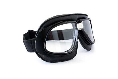-. Feature : Frame: mat black - mat black lens' profiles - Mat Black Hooks / Clear lenses in polycarbonate 2,2mm anticrash - 100% UV protection - Anti-misting aerators into top and bottom of frames - Wide peripheral vision / Adjustable and elastich strap covered by black silk / Two adjustable hooks are strategically positioned on the frame and on the elastic strap to give a close fit with any open face helmet / Vintage motorcycle googles for and choppers