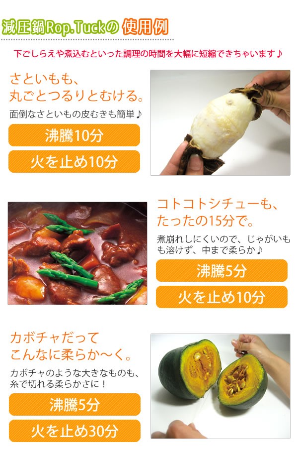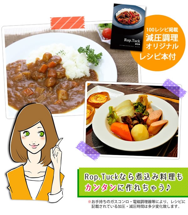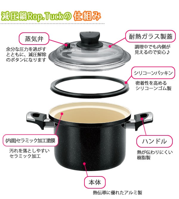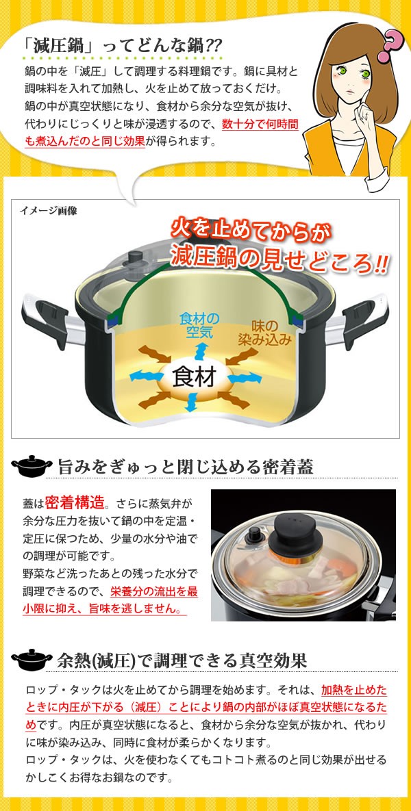 | 鍋の中を「減圧」して調理する料理鍋です。鍋に具材と調味料を入れて加熱し、火を止めて放っておくだけ!!鍋の中が真空状態になり、食材から余分な空気が抜け、代わりに旨みをぎゅっと閉じ込めて栄養分の流出を最小限に抑えます。CO2の排出を抑え、地球と人とお財布にとっても優しい減圧鍋です。 |