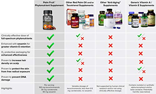 Palm Fruit is the most scientifically researched anti-aging supplement on the market. The plant based nutrients support the skin's natural defense against free radicals to minimize aging from environmental stress. Palm Fruit increases the skin's tolerance to environmental radicals by up to 250% after 12 weeks of supplementation. Carotenoids, tocochromanols, and sesamin help dissipate oxidative stress by supporting the skin's natural antioxidant functions. Palm Fruit is not intended to replace sunscreen or other effective sun protective measures. Research suggests that Palm Fruit can produce a significant reduction in the appearance of wrinkles in healthy adults after 4 weeks of supplementation. The tocotrienols and carotenoids improve skin elasticity and complexion by restoring cellular hydration, stimulating type-1 collagen synthesis, and reducing DNA damage. These fat soluble micronutrients readily absorb into the skin through dietary intake, including the stratum corneum, dermis, and epidermis. Palm Fruit increases the number of hairs on the scalp by an average of 38% after 8 months in men and women suffering from hair loss. The tocotrienols and carotenoids trigger hair growth and produce a fuller head of hair by stimulating IGF-1, vascular endothelial growth factor (VEGF), and keratinocyte growth factor (KGF) in aging hair follicles. Palm Fruit can be used safely with minoxidil (Rogaine) and/or finasteride (Propecia) to reverse hair loss and/or prevent further thinning of the hair. Palm Fruit is a broad-spectrum extract that delivers over 8 naturally occurring forms of vitamin E, and over 12 different carotenoids. Unlike other vitamin E supplements, Palm Fruit includes 90 mg of the lignan sesamin which ensures maximum retention of vitamin E, while avoiding side-effects of excess vitamin E supplementation such as vitamin K depletion. Patented: US Patent 7211274 US Patent 7544822Feature