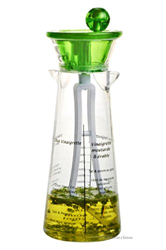 -. Feature : Oil or Vinegar or Salad Dressing Bottle (14 oz Capacity) / 4 Recipes Printed on Bottle / Clear Plastic Construction with Measurements / Built in Spinner to Mix Dressing Before Pouring / Approximate Size: 8.5" x 3" x 3"