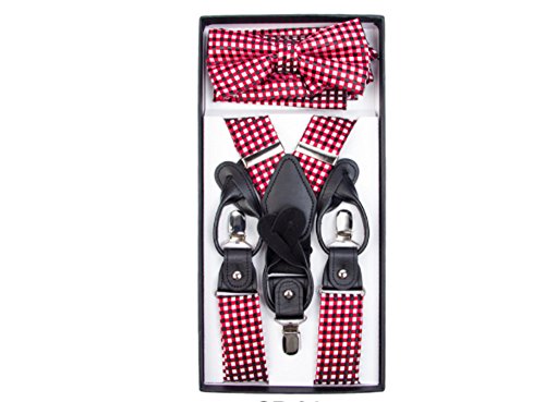Binding : Apparel Product Description Suspender Straps width are approximately: 1 3/8 inches (3.5cm) and Classic Y-shape suspenders are a unique and stylish fashion accessory Suspenders 6 Button holes attach to buttons (included) on your pants, trousers, or other clothing.Three Metal Clips allow for adjustable length Bow Tie is Pre-Tied Dimensions are 5.25"L x 2.5"H Pocket Square measures 10" x 10" 0