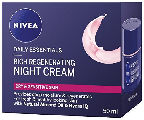 -. Binding : Misc. -. Brand : Nivea -. EAN : 9005800227344 -. Feature : CREAM Intensively moisturises & regenerates skin overnight for smooth feeling skin in the morning. / Enriched with Natural Almond Oil & Hydra IQ the Rich Regenerating Night Cream: / Support's the skin's regenerating process at night thanks to its nourishing formula with Provitamin B5 / The formula with Vitamin E provides a relaxed skin feeling in the morning. / Formulated with Hydra IQ technology to enhance your skin's natural moisturisation. -. IsAdultProduct : 0 -. Label : Nivea -. Manufacturer : Nivea -. MPN : 84799 -. PackageQuantity : 1 -. PartNumber : 84799 -. ProductGroup : Beauty -. ProductTypeName : BEAUTY -. Publisher : Nivea -. Studio : Nivea -. Title : Nivea Rich Face Regenerating Night Cream for Dry to Sensitive Skin 50 ml / 1.6 fl oz