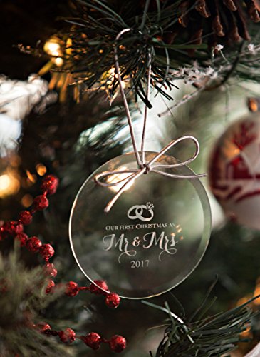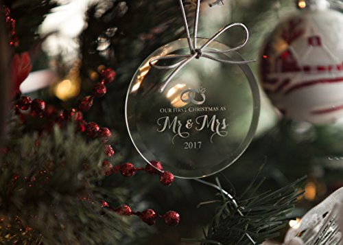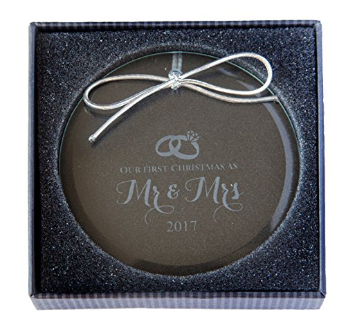 Crystal Wedding Ornament - Our First Christmas as Mr and Mrs 2017 - Elegant Design Etched on Round Jade Crystal Ornament (3 Inches) in Gift Box - Marriage or Bridal Shower Gift Idea for Newlyweds