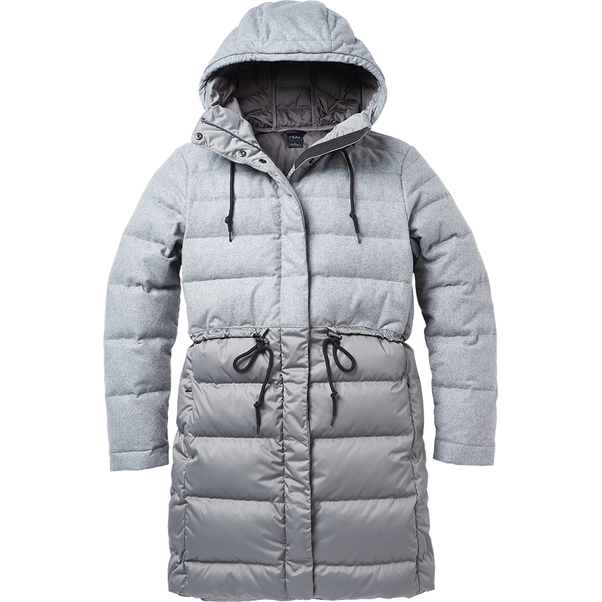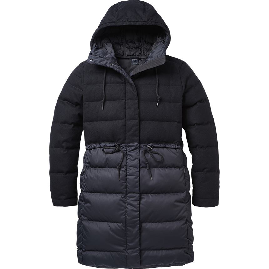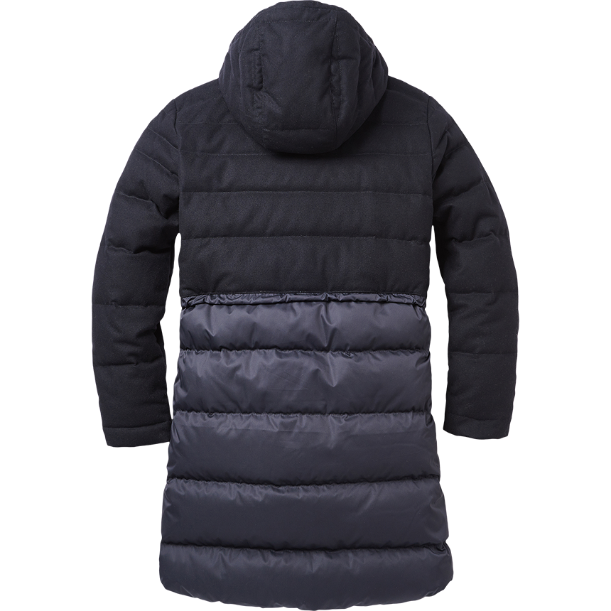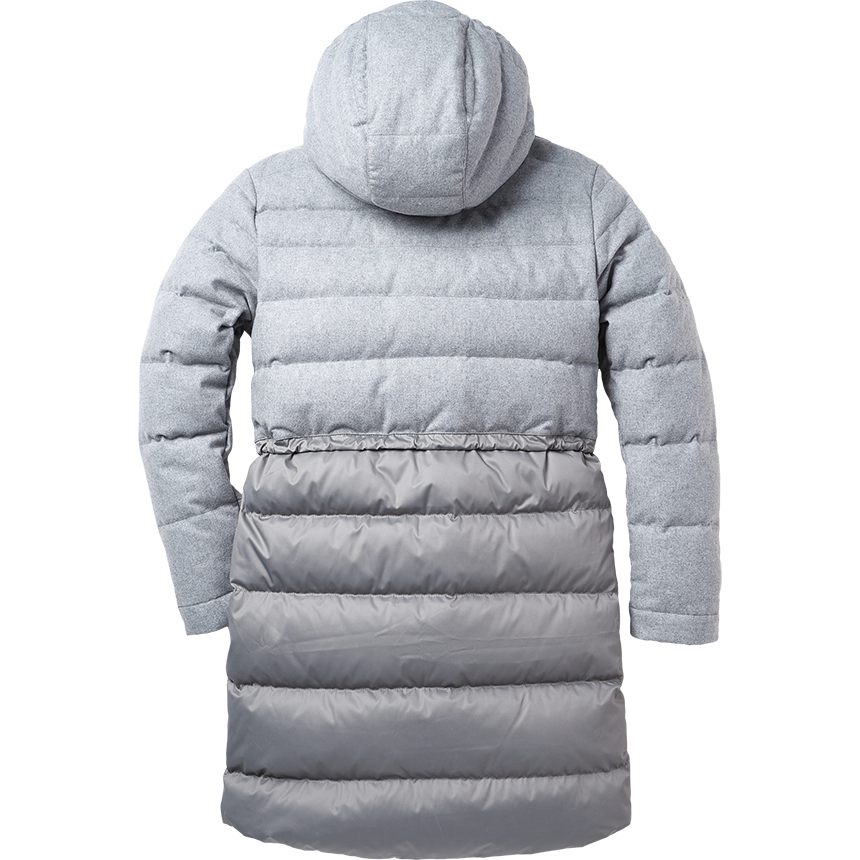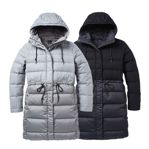 -겉감에 멜톤울 소재와 재생 폴리에스터 이소재를 적용하여 이중적인 외관의 롱다운 자켓