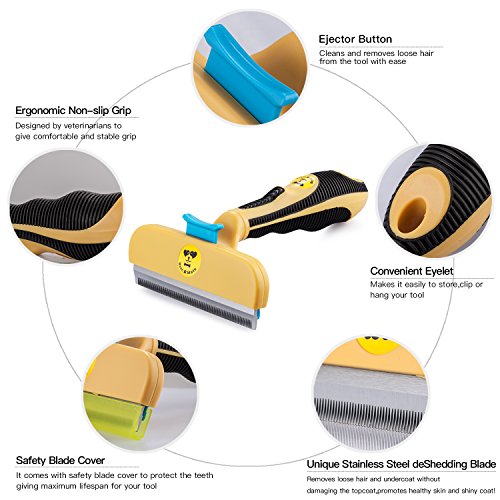 Professional premium pet shedding tool with ejector button, which is lightweight and durable. It reduces shedding by up to 90% with stainless steel edge that will be gentle to the skin of your pets without damaging topcoat.