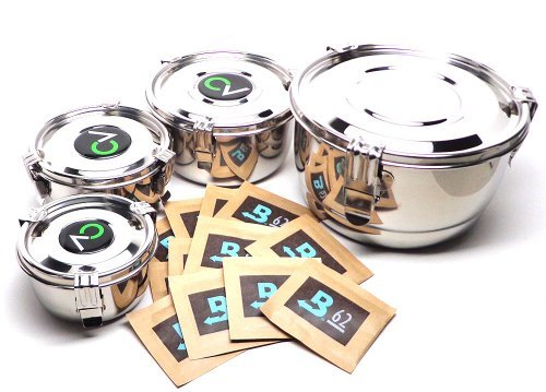BUNDLE OF 5 ITEMS: SMALL, MEDIUM, LARGE AND EXTRA LARGE CVAULT AIRTIGHT STORAGE CONTAINERS WITH 12 EXTRA BOVEDA 8 GRAM 62% HUMIDIPAK REGULATORS