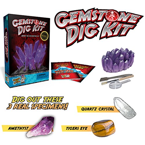- Feature : Excavate real quartz, tiger's eye and amethyst gemstones with this hands-on digging kit / Kit includes digging tool, brush and magnifying glass & is a great way to start a rock & mineral collection / Perfect gift for any kid aged 6-12 that is interested in rocks, science, geology, or paleontology / The 12-page info guide is filled with cool science facts about gemstones and was written by teachers / Activity booklet contains 10 wonderful puzzles and games for hours of extra fun and learning