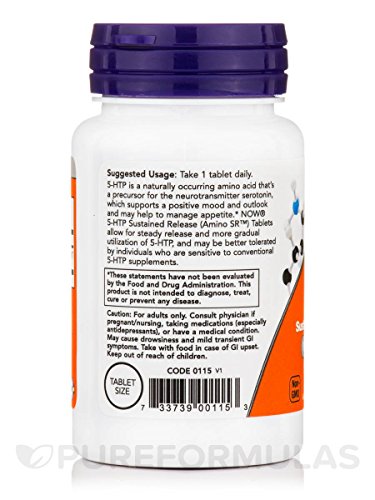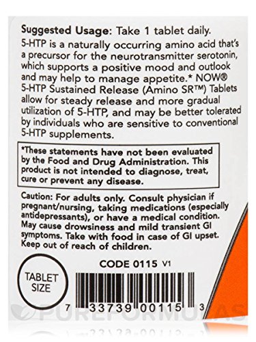 Studio : Now Foods Publisher : Now Foods Binding : Health and Beauty Product Description 5-HTP 200 mg Sustained Release - Amino SR 90 TabletProduct Description 5-HTP is a naturally occurring amino acid thats a precursor for the neurotransmitter serotonin, which supports a positive mood and outlook and may help to manage appetite.* NOW 5-HTP Sustained Release (Amino SR) Tablets allow for steady release and more gradual utilization of 5-HTP, and may be better tolerated by individuals who are sensitive to conventional 5-HTP supplements. Supplement FactsAmount Per Serving% Daily Value***5-HTP (5-hydroxytryptohan) (from Griffonia simplicifolia Extract) (Seed)200 mg* *Daily Value Not Established ***Percent Daily Values are based on a 2,000 calorie diet