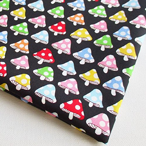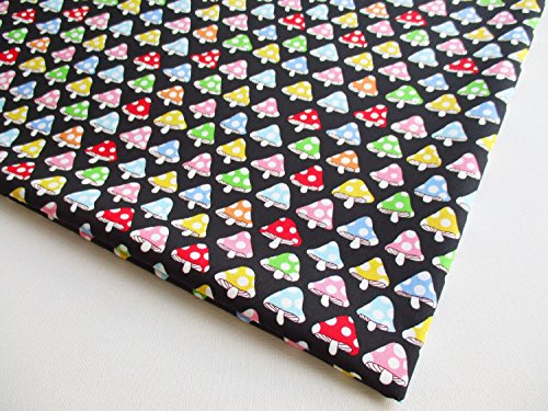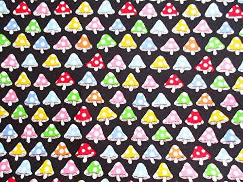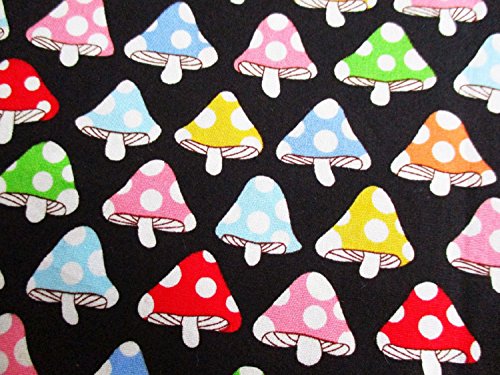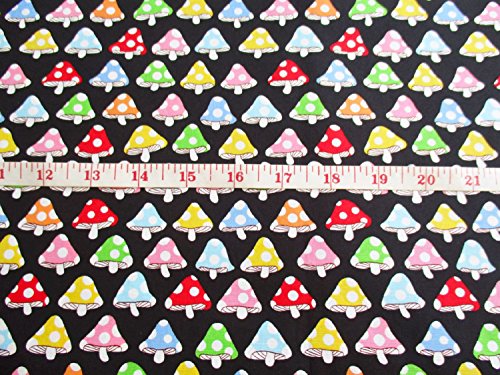 Mushroom Fabric - Colorful Mushroom on Black Cotton Fabric By the Yard (CT428)