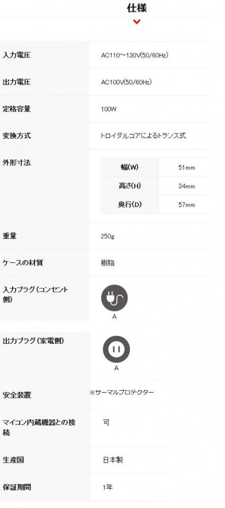 | 仕様 | 安全装置:サーマルプロテクター 入力電圧:AC110~130V(50/60Hz) 出力電圧:AC100V(50/60Hz) 定格容量:100W 変換方式:トロイダルコアによるトランス式 入力プラグ(コンセント側):A 出力プラグ(家電側):A マイコン内蔵機器との接続:可 コード長:約500mm |