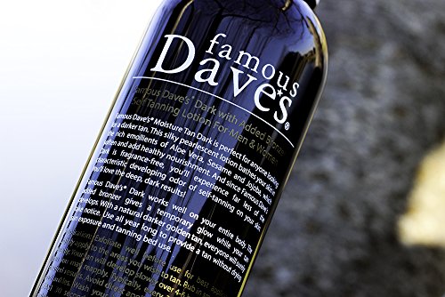 GET READY FOR AN AMAZING GOLDEN BROWN, NATURAL SUNLESS TAN. Famous Dave's Small Batch Reserve self tanner is a creamy and smooth medium to dark sunless tanning lotion that has been field tested and has received rave reviews from many of our most loyal customers as well as beauty bloggers from around the world. Our goal was to make the silkiest, most moisturizing, golden self tanner available anywhere. Because we manufacture Famous Dave's Small Batch Reserve self tanning lotion in smaller batch sizes, don't expect to find our tanner in your big box stores anytime soon...although you may find it in luxury boutiques, gift stores, and salons. Famous Dave's Small Batch Reserve Fortified With: Organic Argan Oil - Ideal for all skin types, Argan Oil improves skin hydration Hyaluronan - Hyaluronic Acid plays an important role in tissue hydration, lubrication and cellular function. Incredibly, Hyaluronic Acid is able to hold more water than any other natural substance - making it one of the world's best moisturizers. CoEnzyme Q10 - Provides antioxidant protection to the lipids in cell membranes Matrixyl 3000 - Reduces the appearance of wrinkles and brings back a youthful look Organic Aloe Vera, Sesame, and Jojoba oil- softens and adds moisture. Creamy lotion which is easy to distribute evenly on your body. Can be used all year round to give the most natural-looking instant tan you will ever have from a bottle!Feature