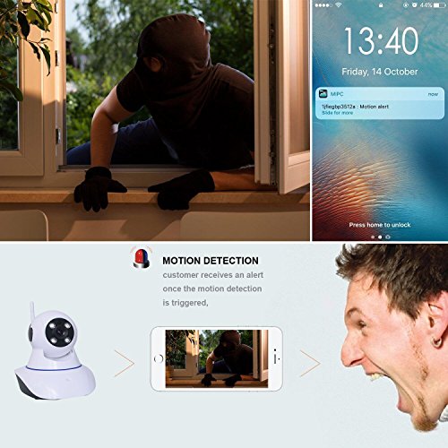 -. Feature : Remote Viewing: With the app on your iphone, android phone and PC, you can remote view your home, baby, pet anytime and anywhere. / Support infrared night vision: 0.3 LUX low illumination, 4 LED lights, infrared night vision distance 15 meters, let monitor night like day! / Built in microphone and speaker, super perfect listening quality! Restore the live scene / Using P2P cloud technology, plug and play, without complex settings, can penetrate all kinds of broadband networks, more convenient to watch / Support mobile phones and computers while remote video monitoring and listening, two-way voice intercom can be achieved