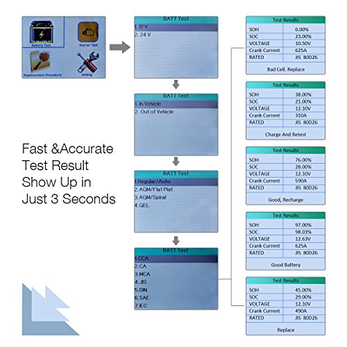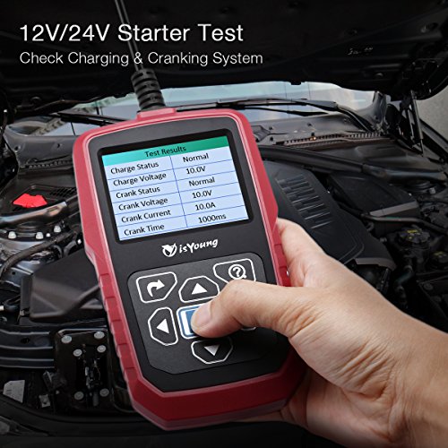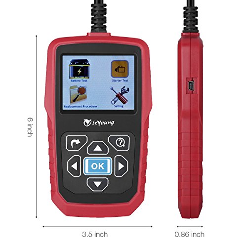 - Starter Test and Cranking / Charging System Test: isYoung battery tester can easily, quickly and accurately measure the actual cold cranking amps capability of the vehicle starting system and charging system, healthy state of the battery itself, and common fault of the vehicle starting system and charging system, which can help you or mechanic to find the problem quickly and accurately.