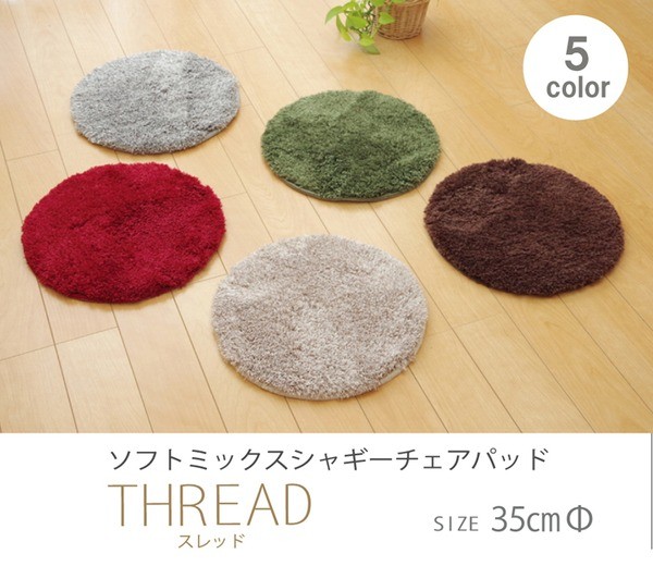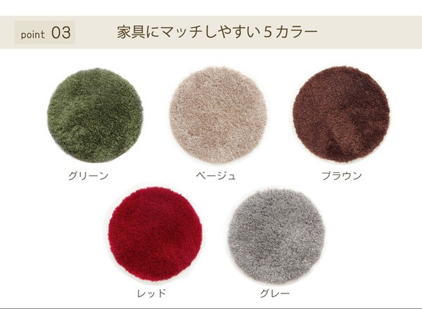 2色の糸を使用した無地調のラグです。5色のカラー展開と、4つのサイズ展開でお部屋に合った色、サイズをお選びいただけます。同じ生地を使用したチェアパッドもご用意していますので、ラグとパッドをトータルでコーディネートも可能です。裏面には滑りにくい加工を施しており、安心してご使用いただけます。25mmのパイルハイはふかふかとした踏み心地で、年間ご使用いただけます。