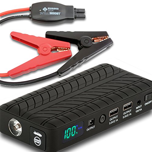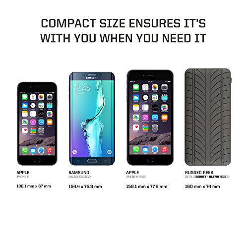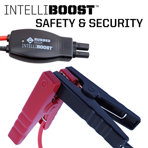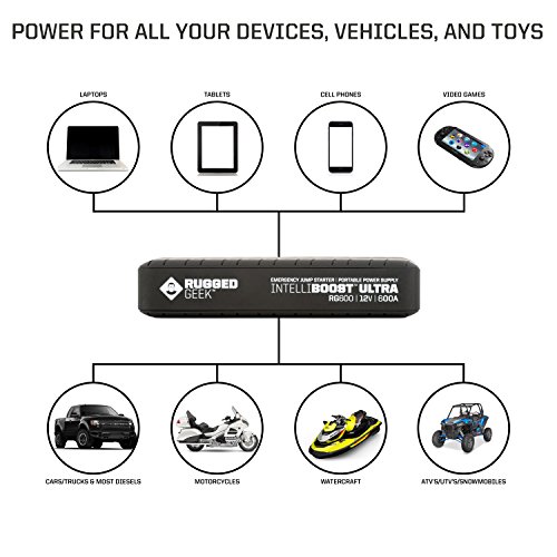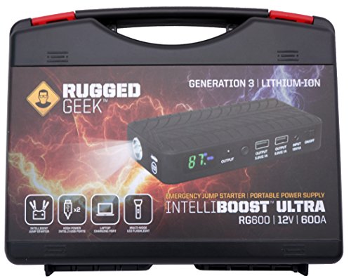 Rugged Geek INTELLIBOOST 600A Portable Jump Starter and Power Supply with LCD Display. USB Laptop Charging. Emergency Auto Jump Pack Battery Booster for Cars, Trucks, SUVs and more.