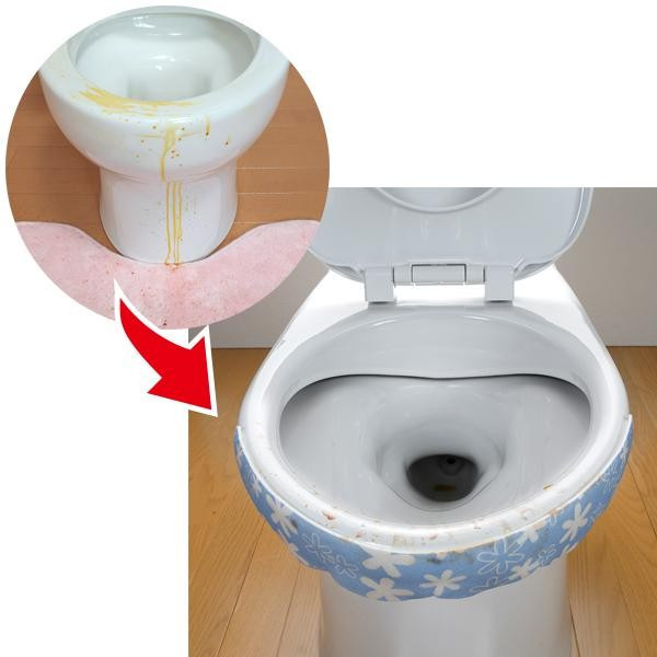 | 便器の側面上部のふちに貼り、便器が汚れるのを防ぐテープです。テープ状になっているので、まわり全体の汚れを防いでくれ、面倒な便器そうじ、床拭きの手間が減ります。また、ハサミでカットして、必要な長さでお使いいただくこともできます。 |