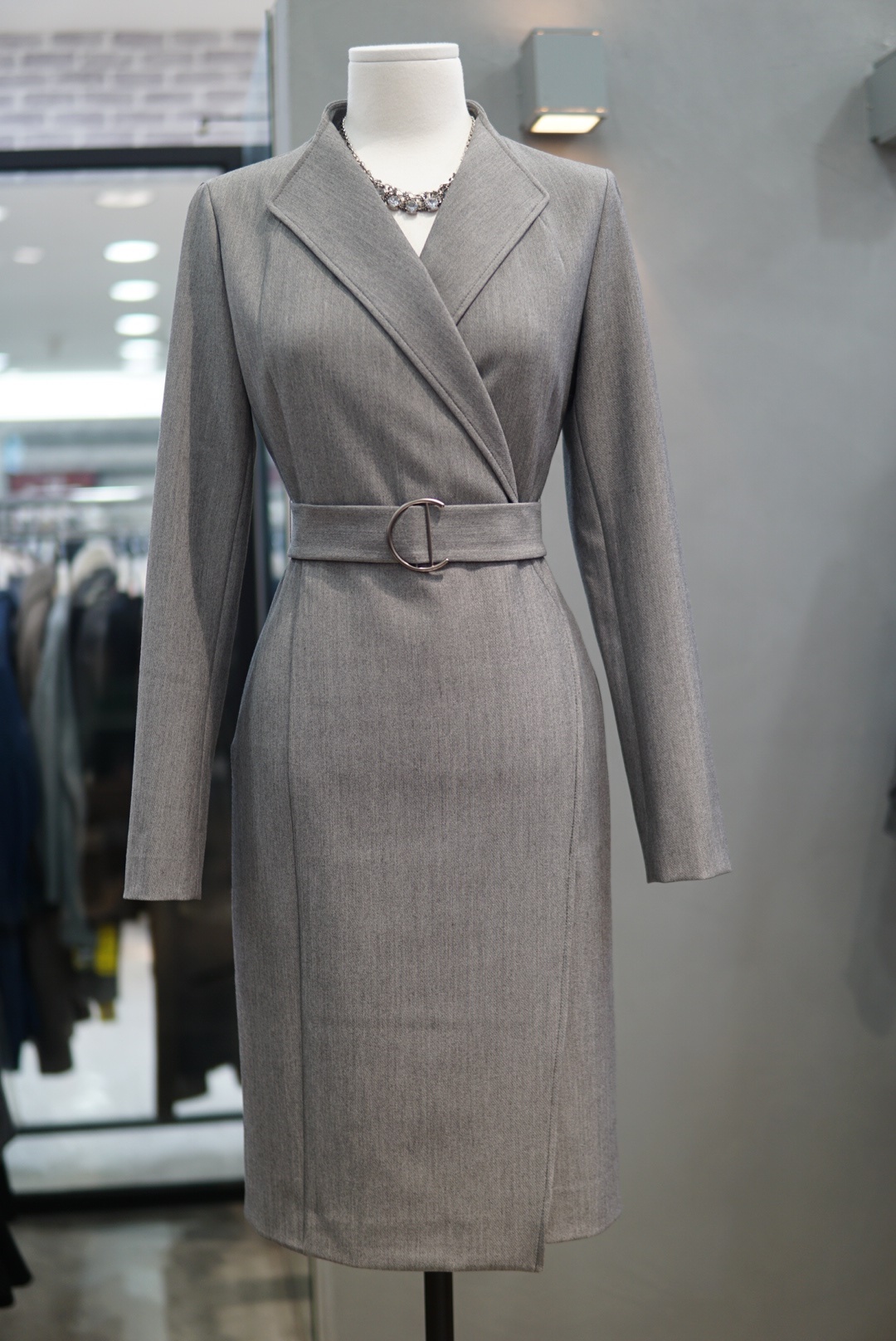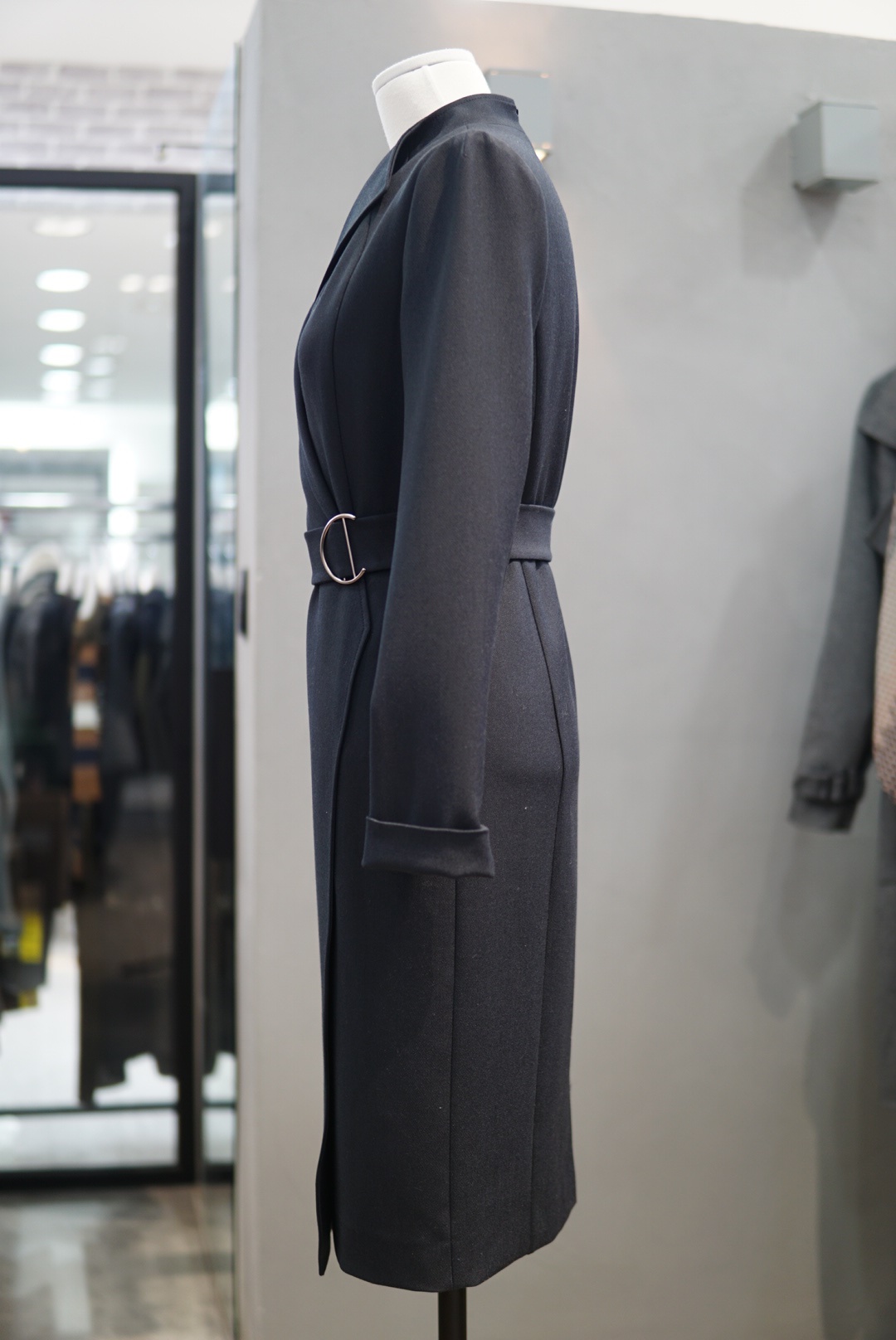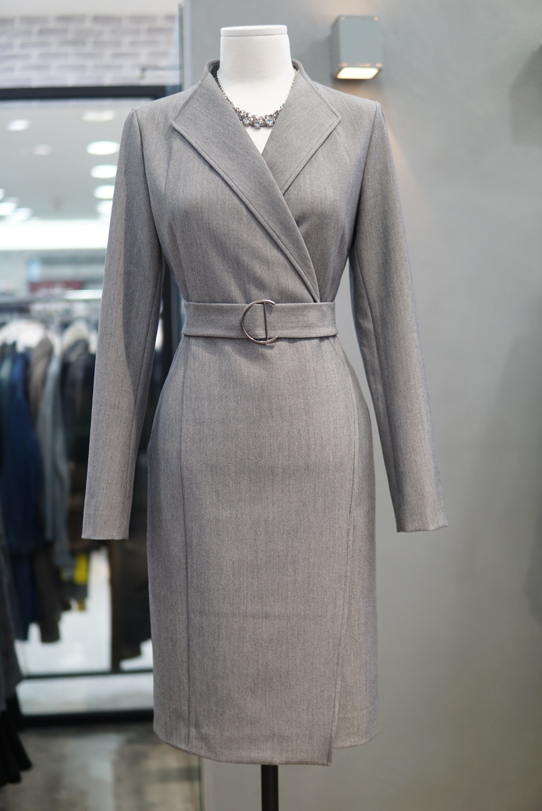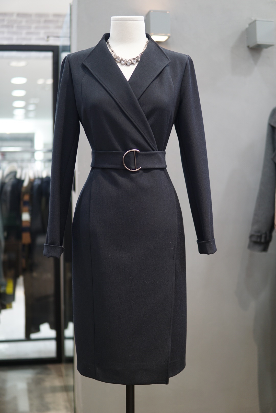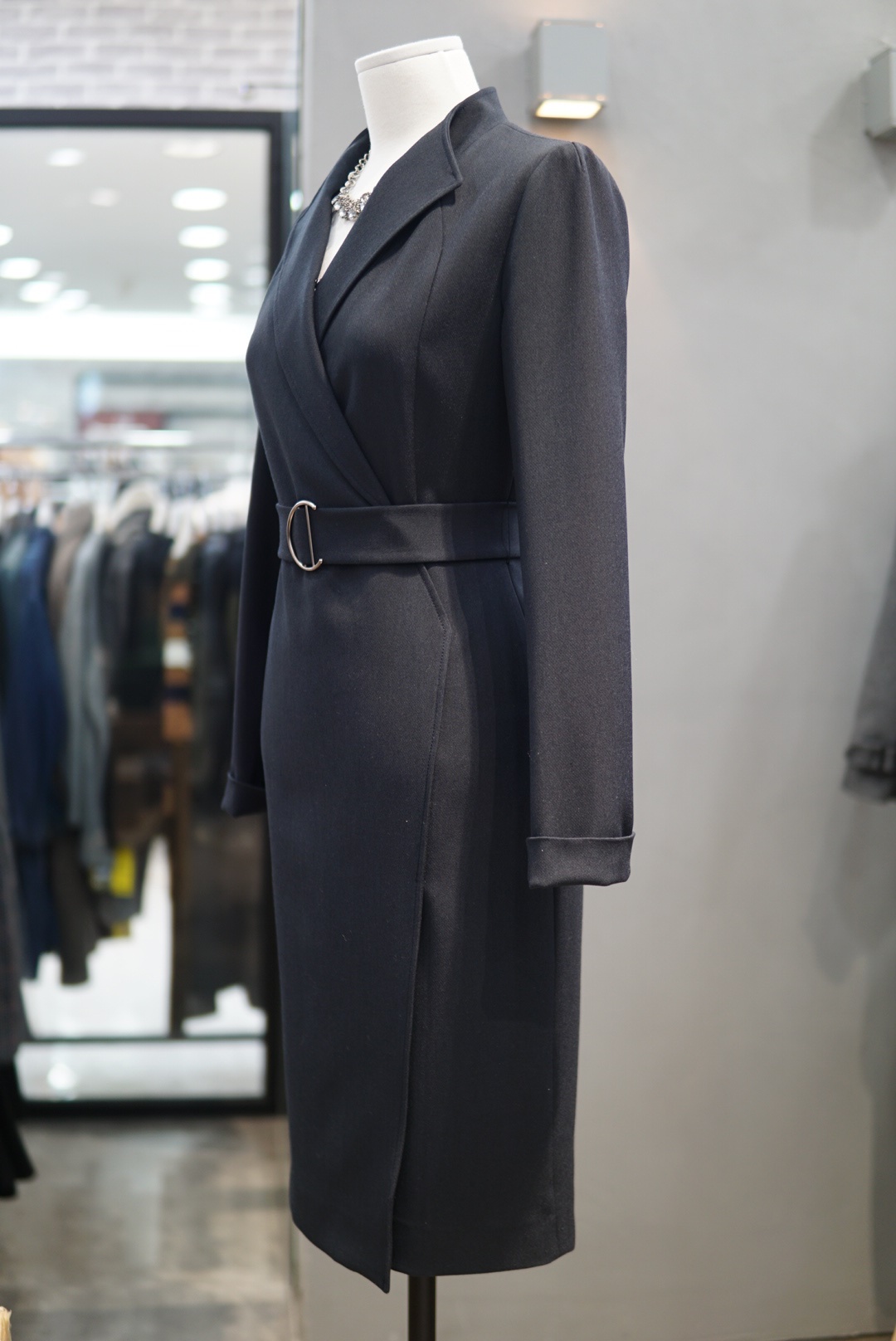 카라 넥라인에 버클 벨트로 포인트를 주면서