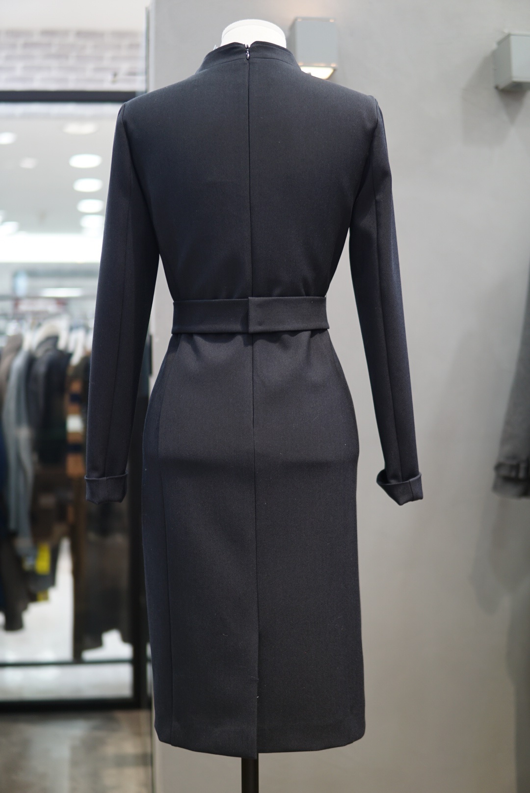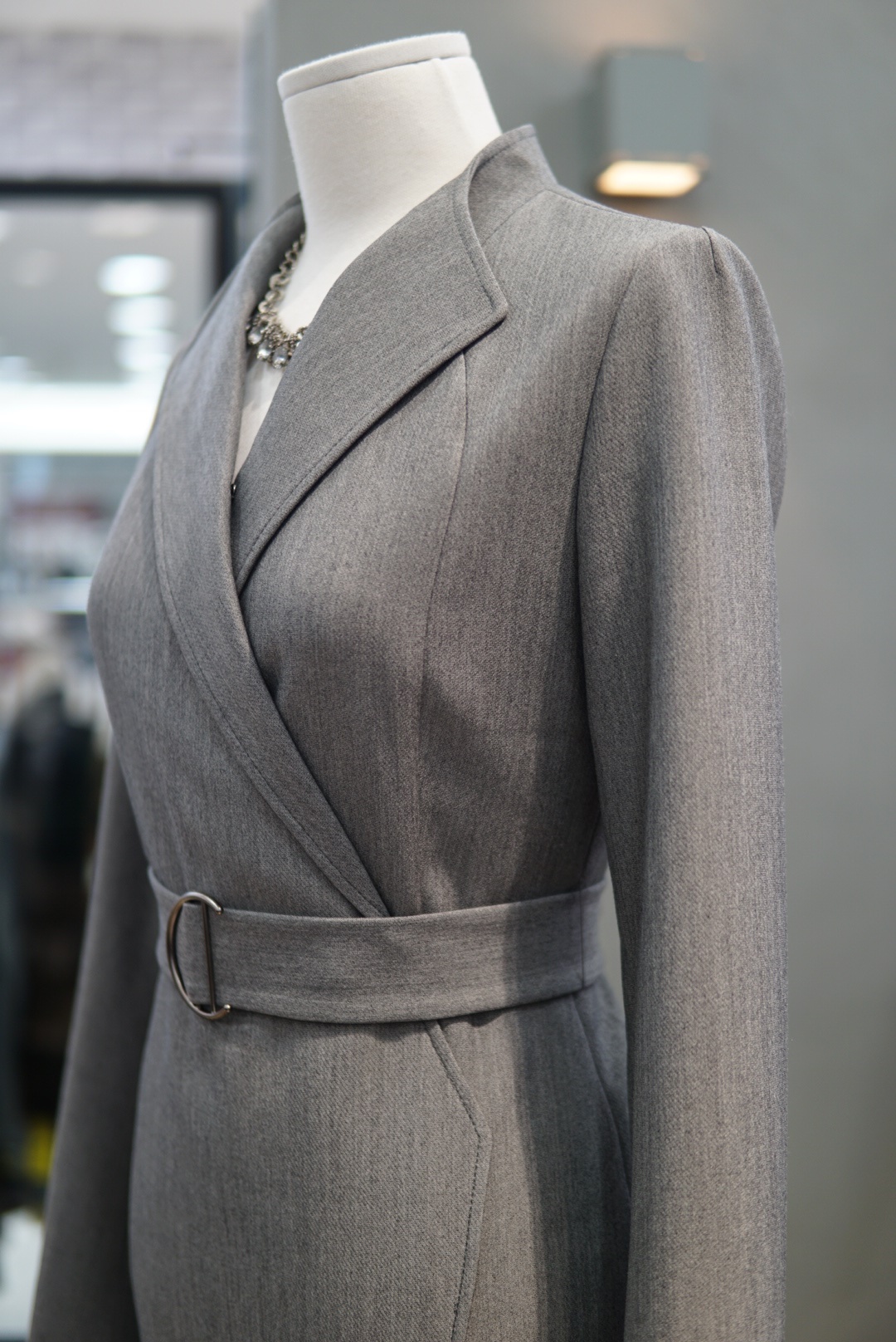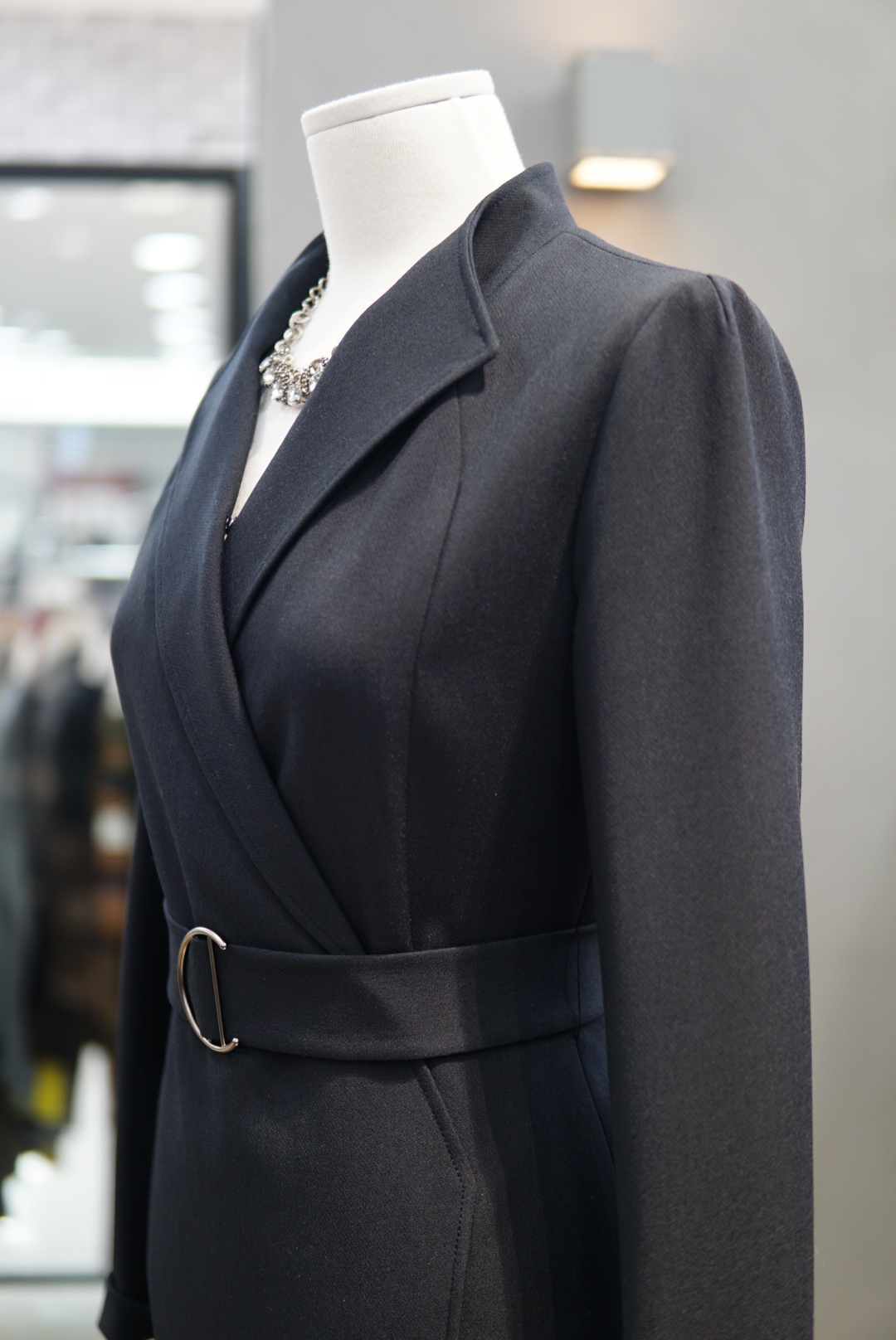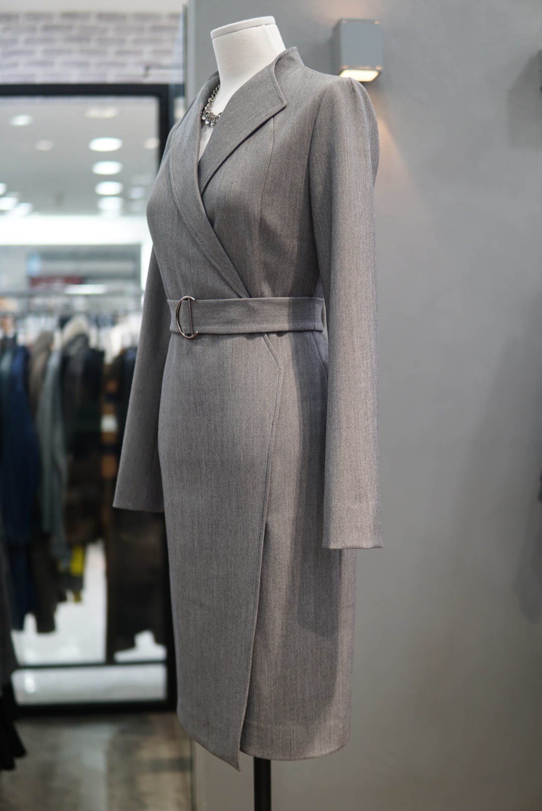 카라 넥라인에 버클 벨트로 포인트를 주면서