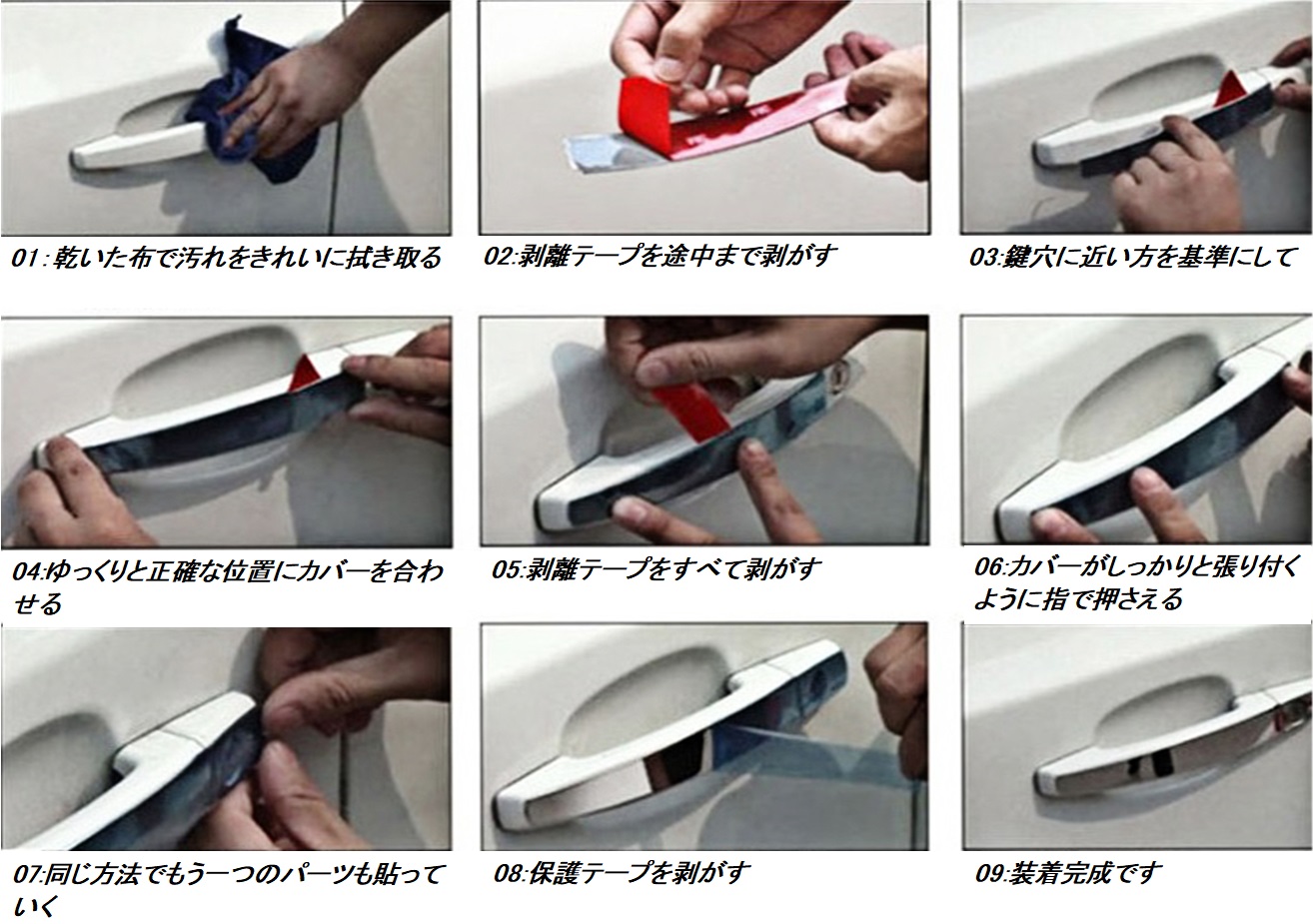 ・ セット内容:前後ドアノブカバーセット ドアノブカバー×4ピース エンドカバー(キー穴有り)×1ピース エンドカバー(キー穴無し)×3ピース 両面テープ付帯 クロス付き