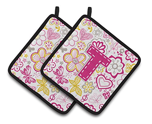 Caroline's Treasures Letter T Flowers & Butterflies pink Pair of Pot Holders CJ2005-TPTHD, 7.5HX7.5W, Multicolor