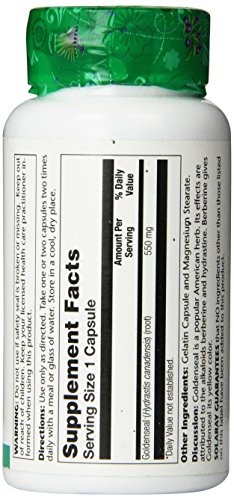 -. Binding : Health and Beauty -. Brand : Solaray -. EAN : 0076280013238 -. Feature : Can be taken daily to help keep the digestion system on track / Contains bitter alkaloids that have been shown to support the digestive systems to maintain healthy, normal function / Shown to strengthen the immune system to block bacteria that can lead to illness -. IsAdultProduct : 0 -. Label : Solaray -. Manufacturer : Solaray -. Model : 076280013238 -. MPN : 076280013238 -. NumberOfItems : 1 -. PackageQuantity : 1 -. PartNumber : 076280013238 -. ProductGroup : Health and Beauty -. ProductTypeName : HEALTH_PERSONAL_CARE -. PublicationDate : 2014-10-04 -. Publisher : Solaray -. ReleaseDate : 2015-03-19 -. Size : 100 -. Studio : Solaray -. Title : Solaray Goldenseal Root Capsules, 550 mg, 100 Count -. UPC : 076280013238