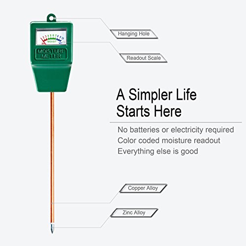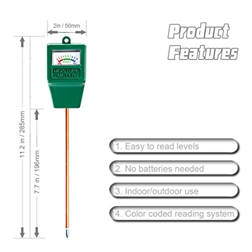 -. Feature : Easy to read moisture levels from 1 to 10 scales. Dry(1-3 red zone), Moist(4-7 green zone),Wet(8-10 blue zone ). Use the Moisture Meter to easily check on the condition of your plants. / No Batteries or Electricity Needed: No batteries or electricity needed, just plug it in and read the scale. Color Coded Reading System: Color coded reading system, from red, green to blue. Help you know your soil more clear and care your plants more rational. Use the Moisture Meter to easily check on the condition of your plants. / Easy to Read Levels: Easy to read moisture levels, including ten scales. Measure soil's moisture content at root by just plugging in the probe. Promote plants' healthy growth. You will never over/under water your plants again. Your best plant care hygrometer / Compact and portable design for indoor/ outdoor use. Let you know when to water. Ideal tool for your plants, suitable for outdoor and indoor plants, gardens and grass lawns. / Color Coded Reading System: Color coded reading system, from red, green to blue. Help you know your soil more clear and care your plants more rational. Use the Moisture Meter to easily check on the condition of your plants.