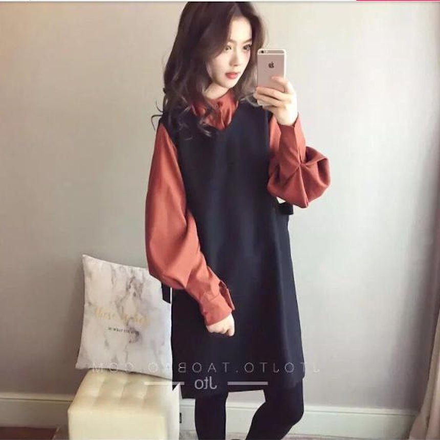 ボリュームたっぷり袖のブラウスとミニ丈ワンピースの2ピースセット。
