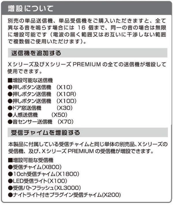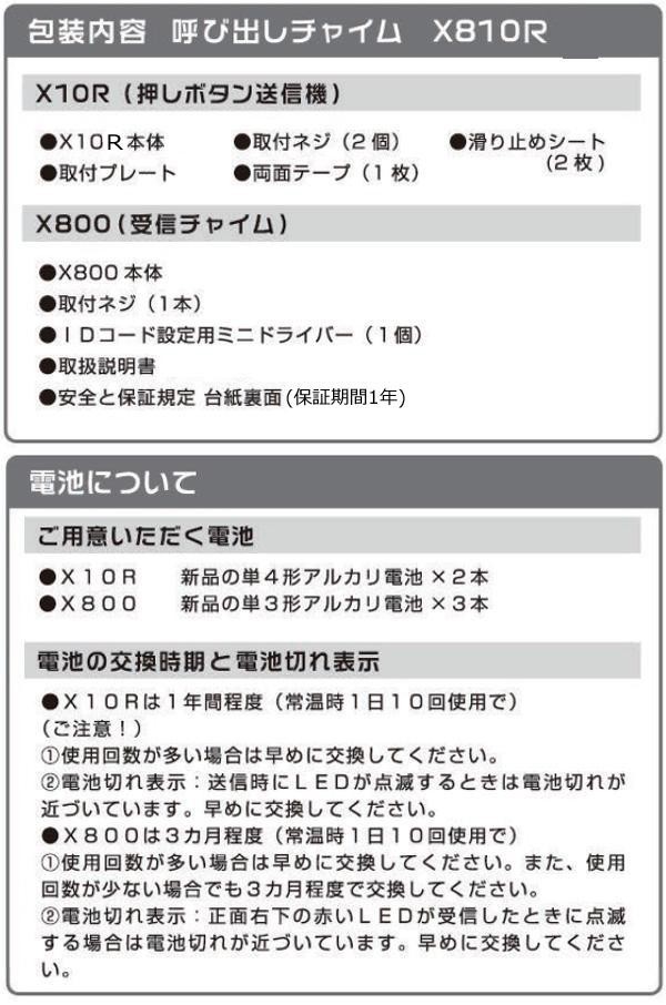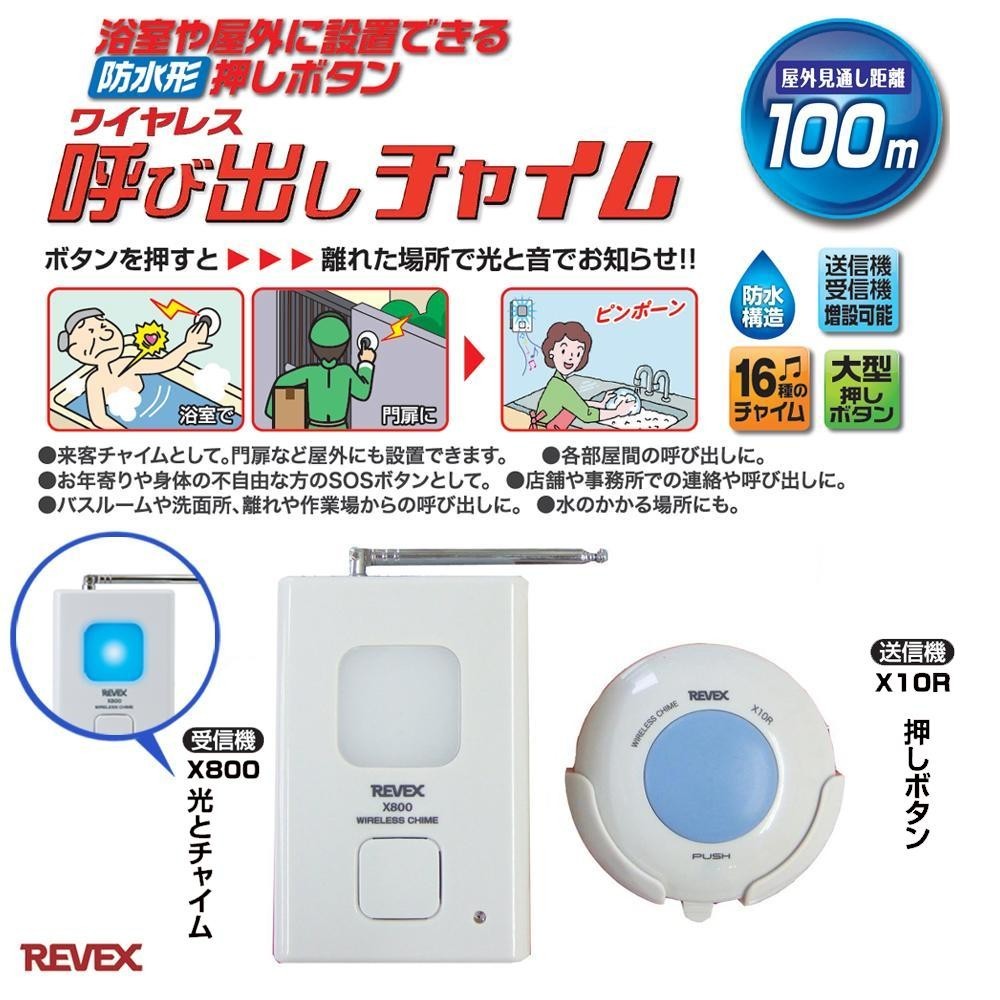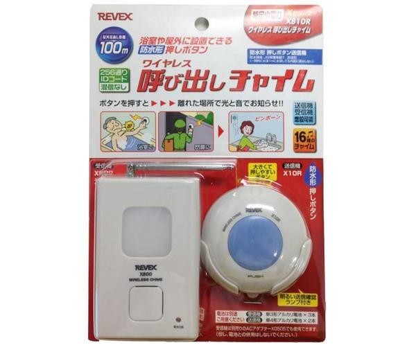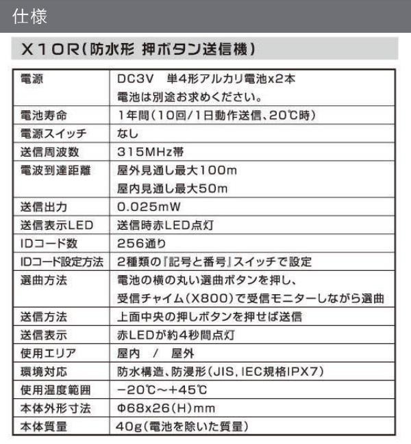 | 押しボタンを押すと、離れた場所にある受信機が光とチャイム音でお知らせします。押しボタン送信機は防水形なので浴室や屋外でも使用できます。※受信機(X800・送信機(X10R)ともに電池は付属しておりません。 |