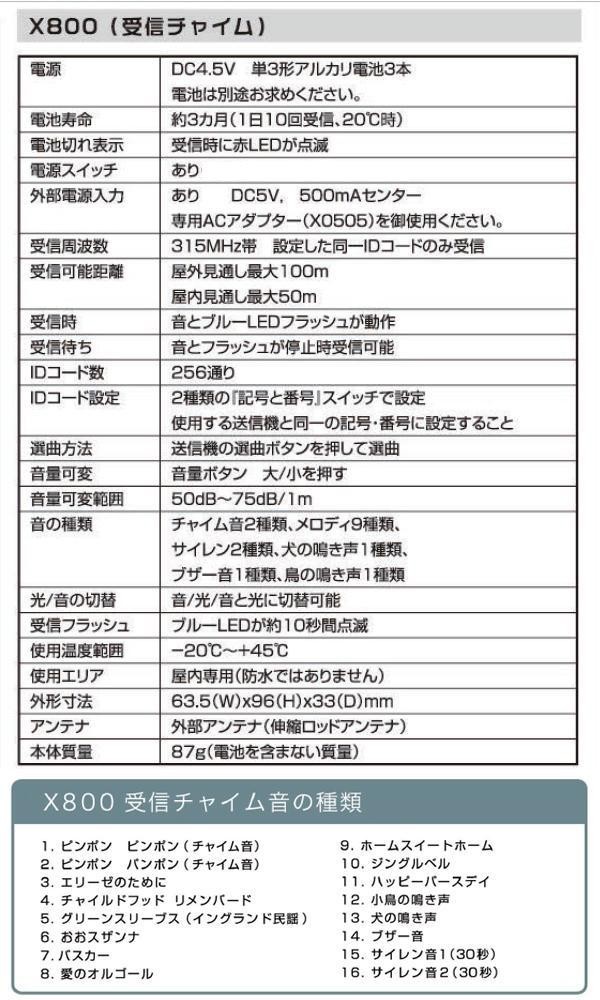 押しボタンを押すと、離れた場所にある受信機が光とチャイム音でお知らせします。押しボタン送信機は防水形なので浴室や屋外でも使用できます。※受信機(X800・送信機(X10R)ともに電池は付属しておりません。 |