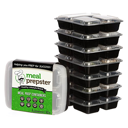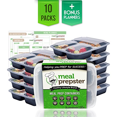 Meal Prepster 3 Compartment Meal Prepping Containers (10 Pack, 32 oz) - Reusable, Airtight, Plastic Food Storage Lunch Bento Box Containers w/ Lids - BPA-Free [Incl. Premium Printable Planners]