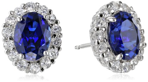 Rhodium plated sterling silver earring featuring oval-cut created blue sapphire bordered by halo of round-cut created white sapphires