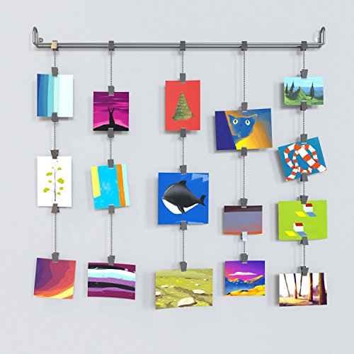 Hanging Photo Organizer Rail With Chains and 32 Clips Gray