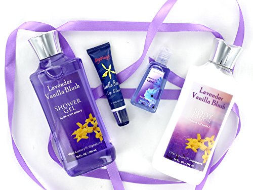 - Body Lotion: Lavender Vanilla Blush body lotion infused with Vitamin E, Aloe, and skin-softening Shea Butter, this formula soften dry rough skin and delivers long-lasting moisturizing.