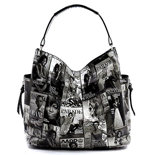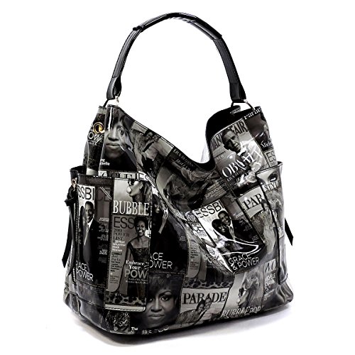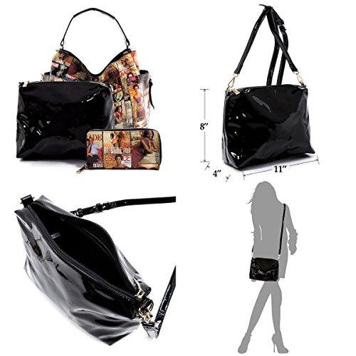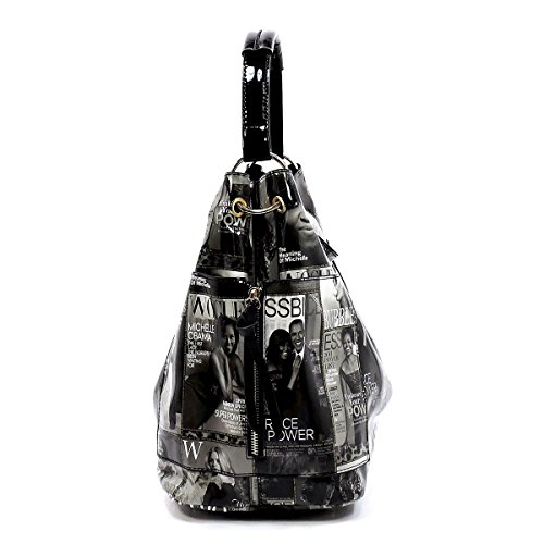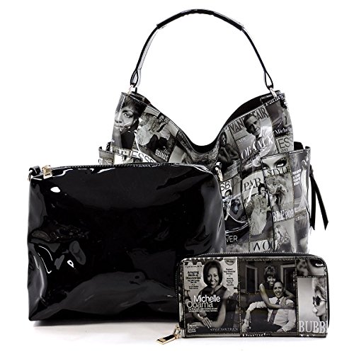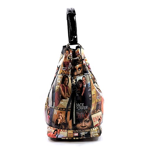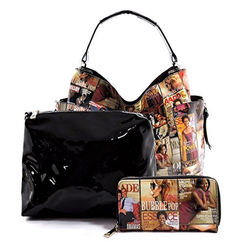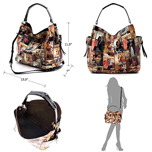 Product Description Glossy Magazine Cover Collage Shoulder Bag Hobo Made of High Quality Patent Faux Vegan Leather (PU leather) Gold-tone hardware. Magnetic snap closure. Detachable shoulder strap. Exterior back zip pocket. 3-in-1 Bag (Shoulder Bag, Crossbody Bag Wallet Set) Bags for women,including shoulder bag, cross-body bag matching wallet. This casual bag will match perfectly with your daily out fit: No need to wait to carry your new favorite daily bag. It'll definitely be a conversation starter! Please note that the image location may vary on the actual product. 0