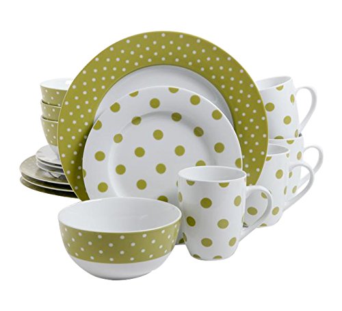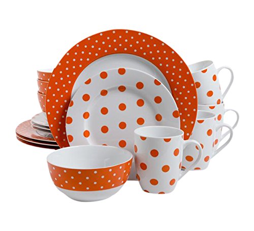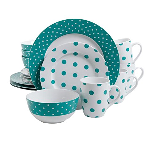 Providing service for four, this dishwasher and microwave safe dinnerware set includes dinner plates, dessert plates, bowls and mugs. The dessert plates and mugs feature dark navy blue dots on white, while the other pieces feature a bold navy band with smaller white dots within.Feature