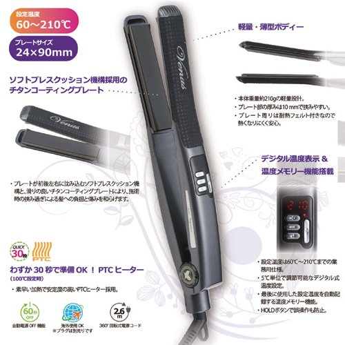 # #의 프로 스타일리스트에게 애용 받고 있는 프로패셔널 시리즈!불과 30초에 준비OK의 PTC히터 채용!소프트 프레스 쿠션 기구 채용《메》`탕 코팅 플레이트! 플레이트가 전후좌우에 가라앉아 붐비는 소프트 프레스 쿠션 기구와,미끄러짐이 좋은 티타늄(티탄) 코팅 플레이트에 의해시술시의 사이에 둬 지나가게 밤발에의 부담이 손상을 부드럽게 합니다.재빠른 가열로 안정 도의 높은PTC히터를 채용하고, 바쁜 아침 그렇지만,전원을 넣고부터 불과 30초에 준비OK.디지탈 온도 표시와 온도 메모리 기능도 탑재하고, 보다 기능적으로.60 분자동 전원OFF기능 타이머 첨부이므로 안심 안전.하드한 움직임에 대응 할 수 있는360도 회전 코드.업무용고데기의 표준 사양의 롱 코드2.6m을 채용.여행에 편리한 해외 대응. ●크기:25.7×2.7×5cm 플레이트크기/2.4×9cm 전원 코드/약2.6m ●전원:AC100-240V(50/60Hz) ●소비전력:0~85W ●설정 온도:약60℃~210℃ ●중량:약360g ●생산국:중국 ●보증서:1년간 부착 ●팩키지크기:31.6×14.6×5.4cm 530g