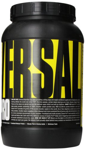 ReleaseDate : 2013-08-31 Studio : Universal Nutrition Publisher : Universal Nutrition Binding : Health and Beauty Product Description Casein pro is a cutting edge protein powder consisting of 100% micellar casein protein only. With no inferior proteins blended in, each scoop of casein pro provides 24 grams of the purest micellar casein in the world. As a "slow-digesting" protein source (and unlike whey protein), micellar casein supplies a time-released and more sustained flow of amino acids into the bloodstream, allowing for a more consistent nourishment of your muscles. Functional and multi-purpose, casein pro can be optimally used between meals and before bed. Each and every delicious scoop of casein pro helps aid in triggering muscle anabolism and staving off muscle catabolism around the clock. 0
