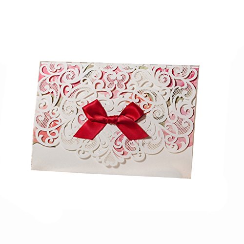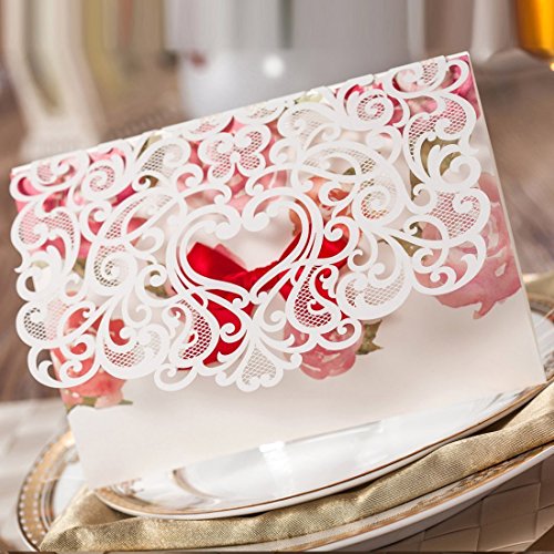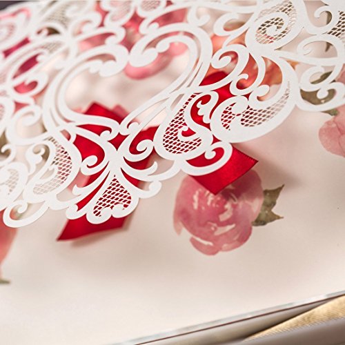 Laser Cut Wedding Invitations Cards Kits Colorful Flower Lace Style Invitation Cardstock for Wedding Party Favors Supplies with Red Bowknot Ribbon Birthday Invites Card Envelope and Seal(20 Pieces)