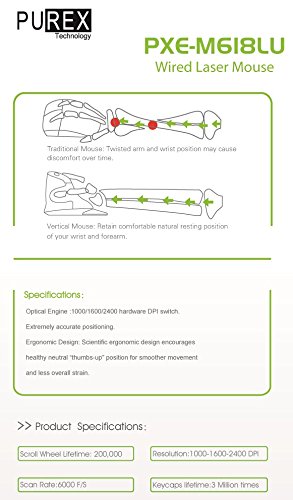 -. Title : PUREX Technology Ergonomic Vertical Wired Mouse supports 1000/1600/2400 DPI, Backward/forward control Thumb Buttons, Removable Palm Rest - Reduces Wrist and Forearm Discomfort - PXE-M618LU