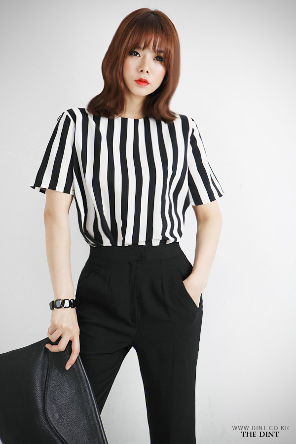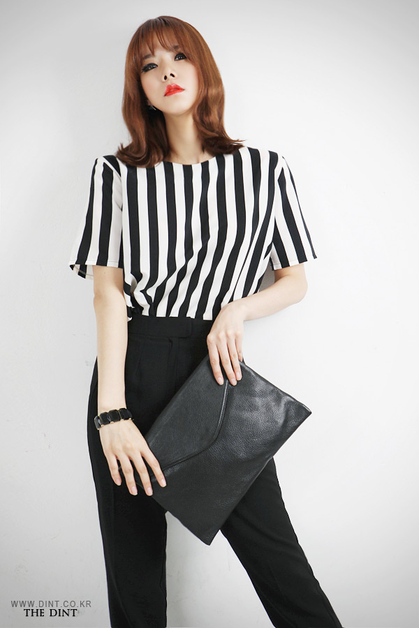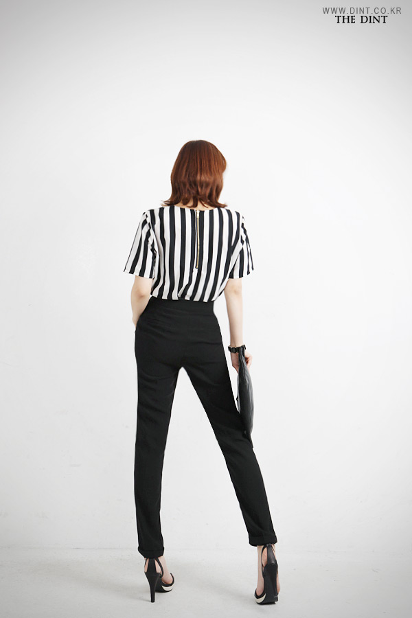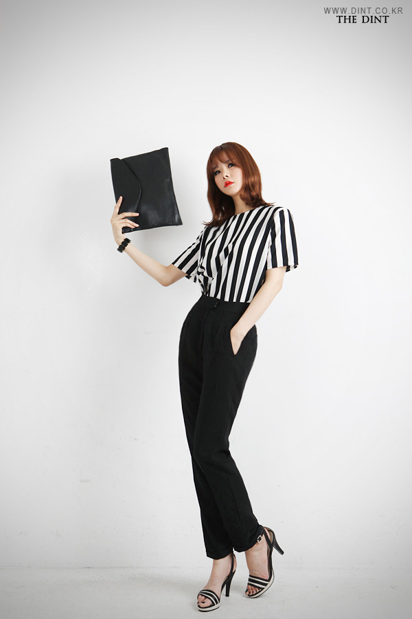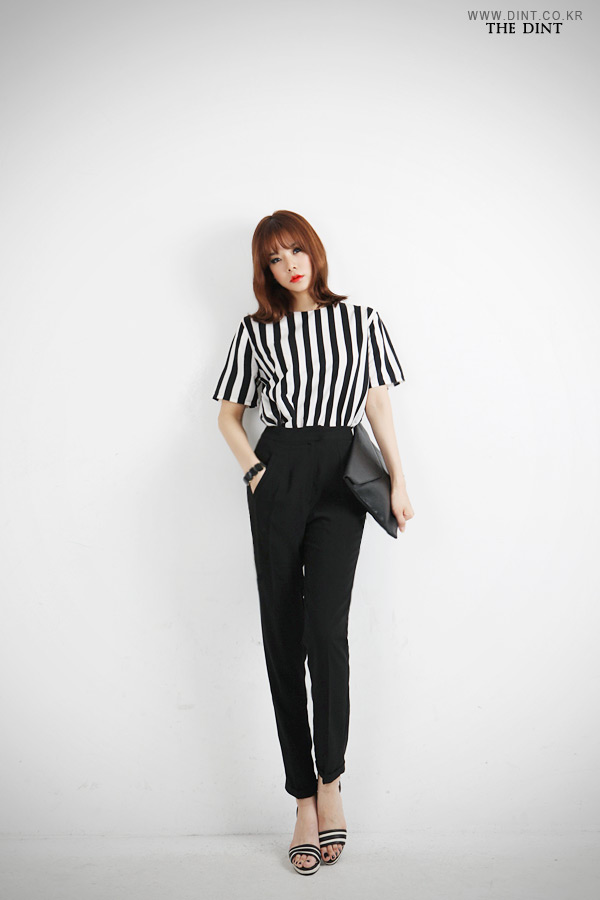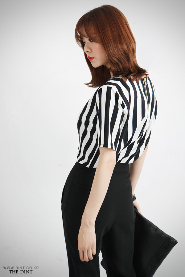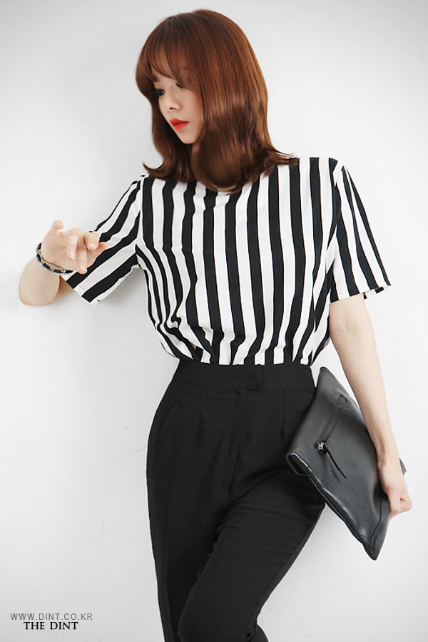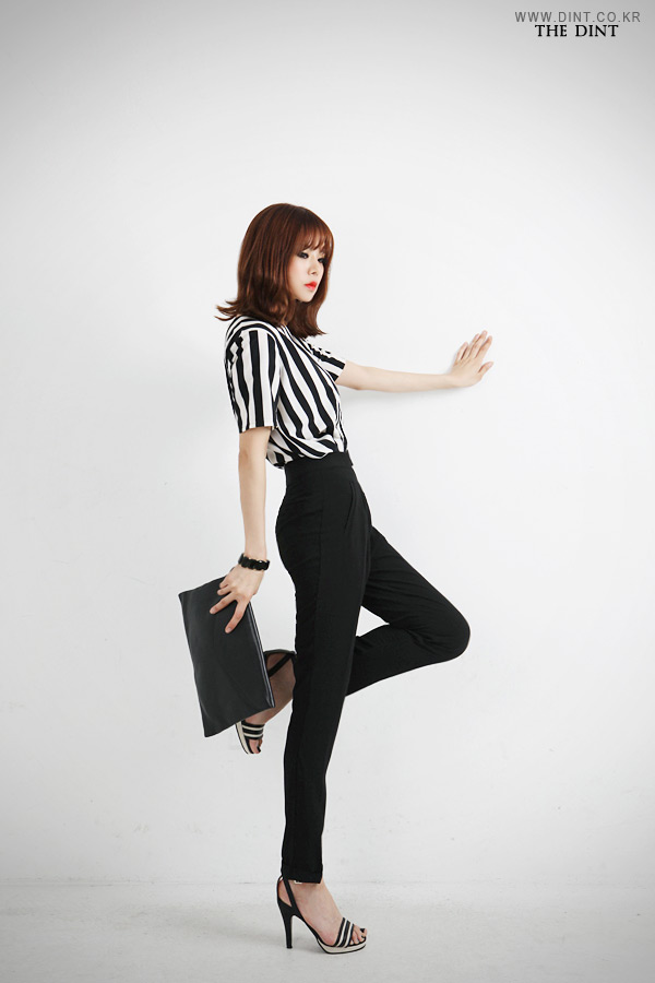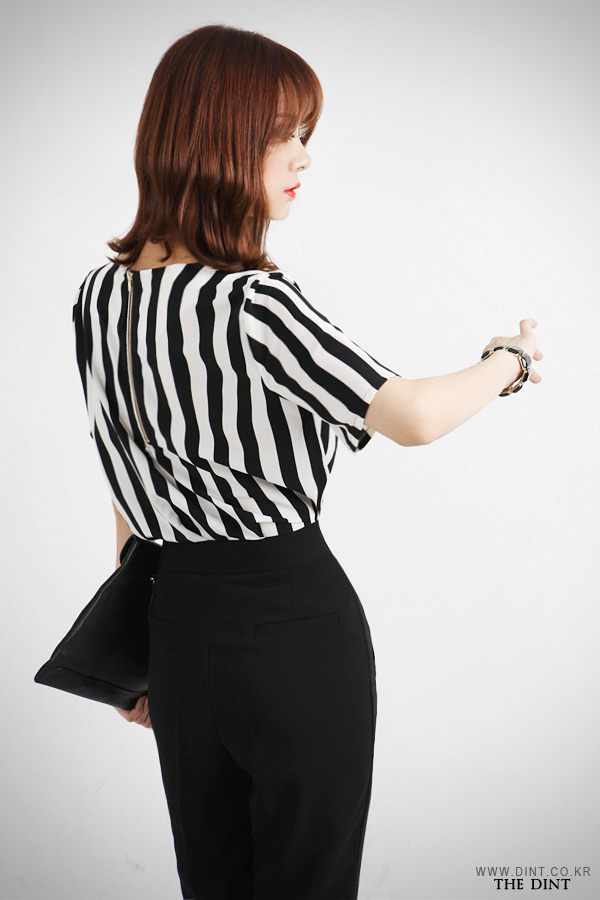 < 모델 코디 제품명 >B867 버티컬 스트라이프 지퍼 블라우스 -> Ivory+Black stP868 하이 롱 세미 슬랙스 -> Black AJ-1979 뱅글 -> Black AR-863 심플 스트라이프 디테일 힐 -> Black