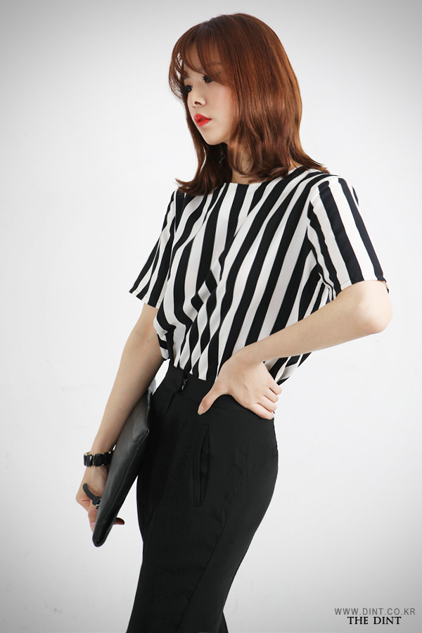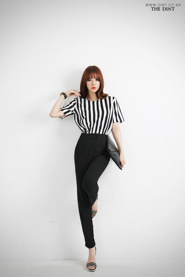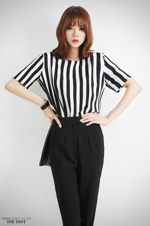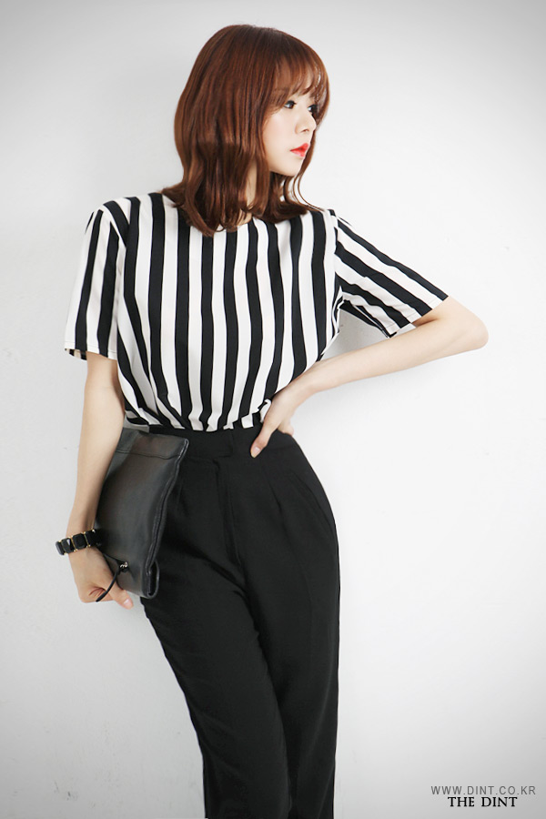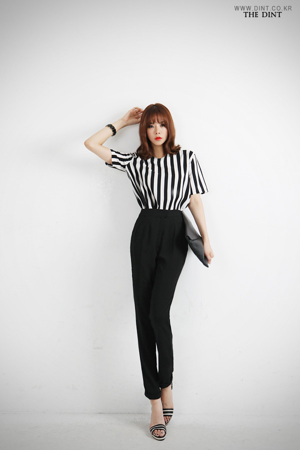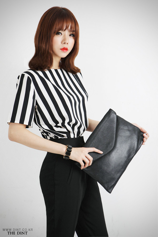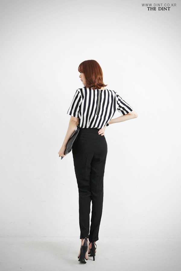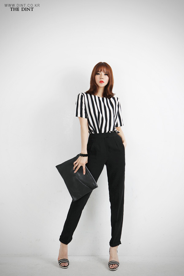 < 모델 코디 제품명 >B867 버티컬 스트라이프 지퍼 블라우스 -> Ivory+Black stP868 하이 롱 세미 슬랙스 -> Black AJ-1979 뱅글 -> Black AR-863 심플 스트라이프 디테일 힐 -> Black