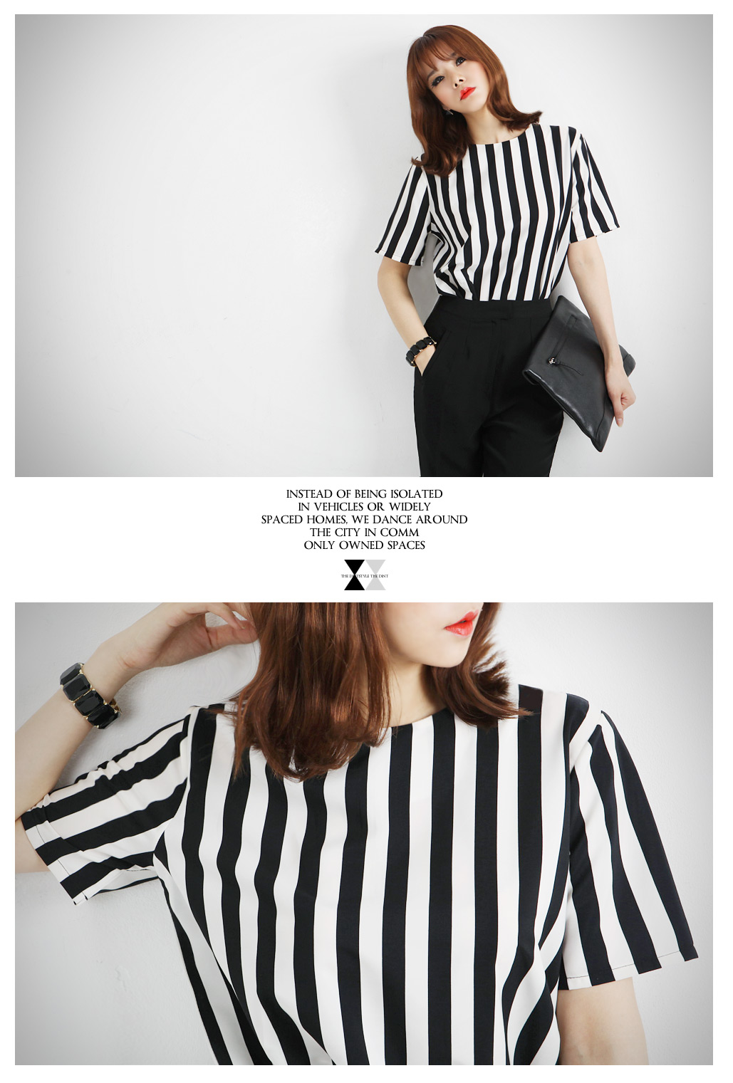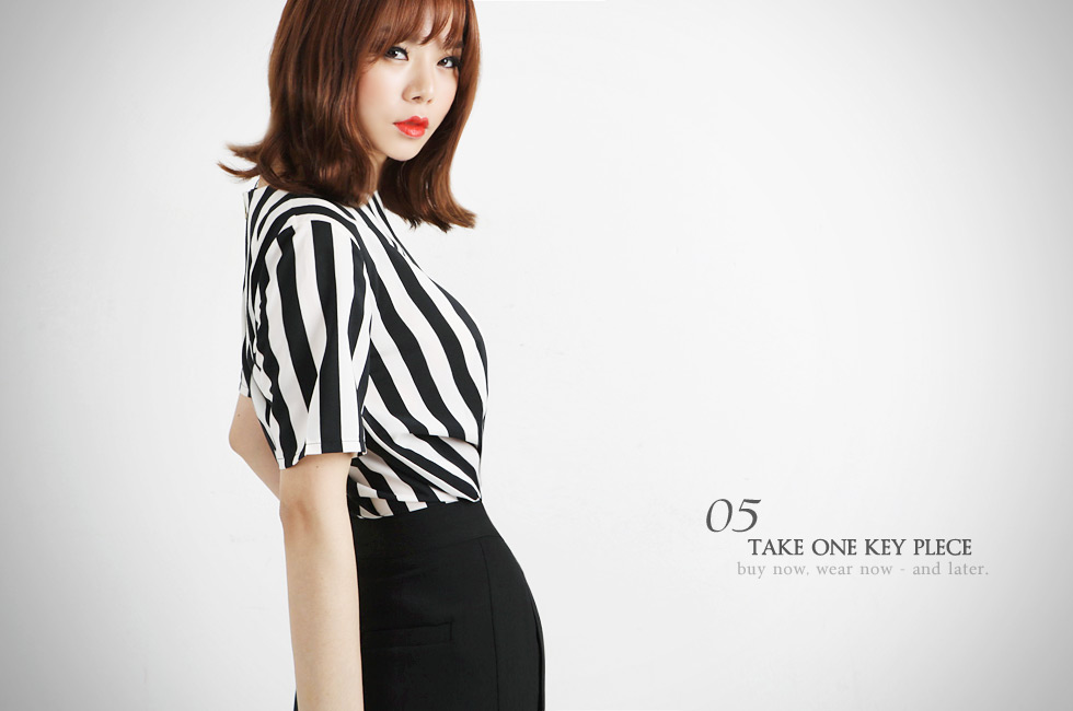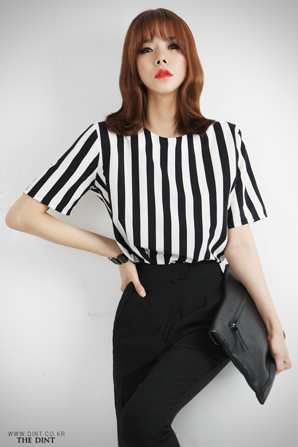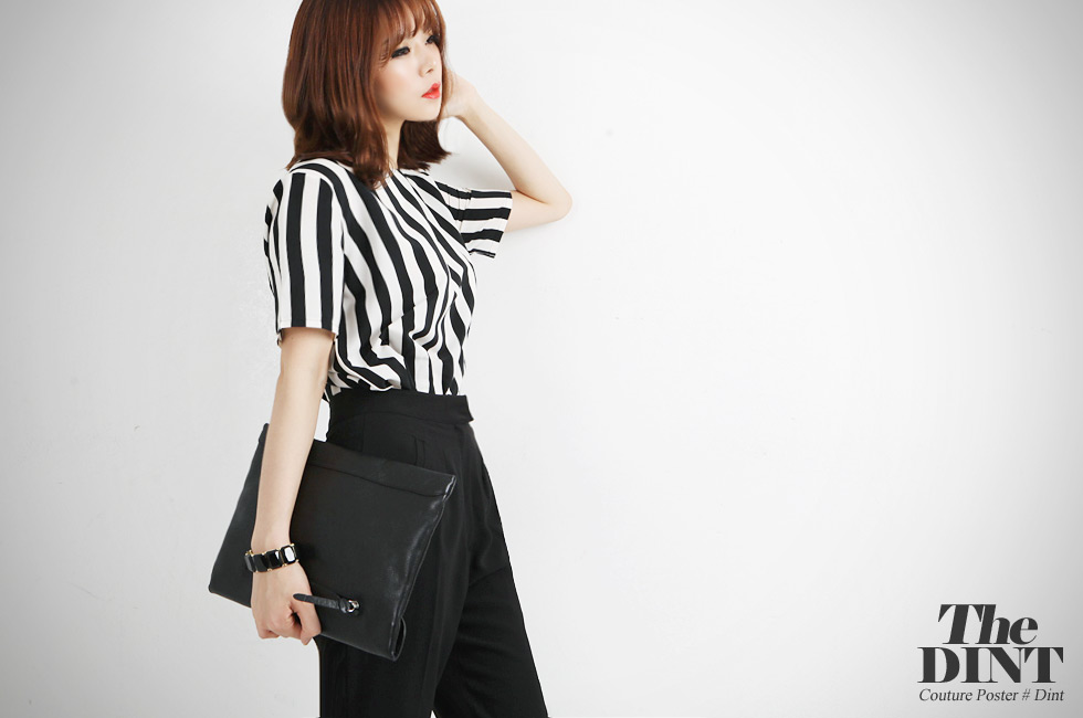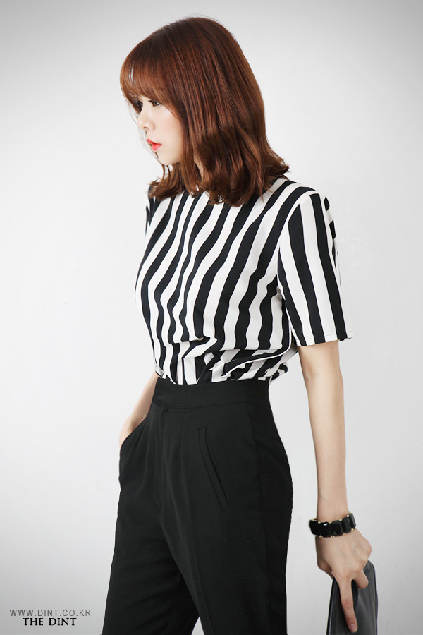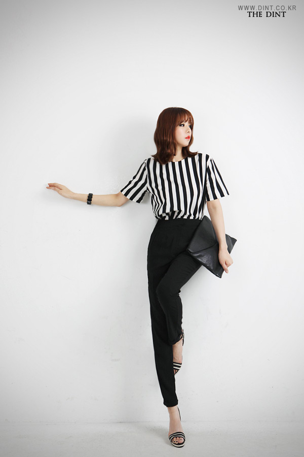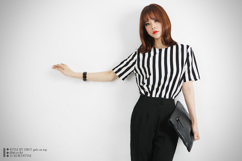 < 모델 코디 제품명 >B867 버티컬 스트라이프 지퍼 블라우스 -> Ivory+Black stP868 하이 롱 세미 슬랙스 -> Black AJ-1979 뱅글 -> Black AR-863 심플 스트라이프 디테일 힐 -> Black