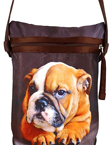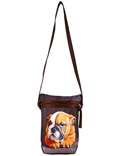 Hunting for a handbag that will set you apart from the crowd? The DIGITAL DOG PRINTED SILK CROSS BODY SLING FOR WOMEN is sure to do the trick, and that's no bull! This adorable bulldog lovers handbag is both FASHIONABLE and FUNCTIONAL and the perfect purse to take along on any outing! Best of all, it's carefully made by skilled artisans in India to ensure that it can stand the test of time. Perfect for any occasion, the Digital Graphic Dog Cross Body Satchel Handbag has a classic satchel shape and features a one of a kind graphic. On the front, a photograph of a cute bulldog puppy has been printed in vivid inks using a digital printer that makes the image highly detailed. The bag is brown in color, and darker brown trim is used to complete the design. With its extra long, strong canvas strap, the Cross Body Satchel Handbag can be worn as a shoulder bag or a CROSS BODY BAG. The purse has a ZIPPER at the top to keep items from slipping out, and it's made from waterproof polyester to protect whatever you're carrying. At 8 inches in width by 10 inches in height by 2.5 inches in depth, the handbag is spacious but still compact for easy carrying. Machine washable in cold water for easy care, the Cross Body Satchel Handbag is fabricated out of luxurious DUPION FAUX SILK. The material should not be ironed and it is best to line dry the handbag in the shade. Slip the Digital Graphic Dog Cross Body Satchel Handbag over your shoulder and get ready to make a doggone big fashion statement! Order this adorable dog lovers handbag for yourself or as a gift for her for any occasion!Feature