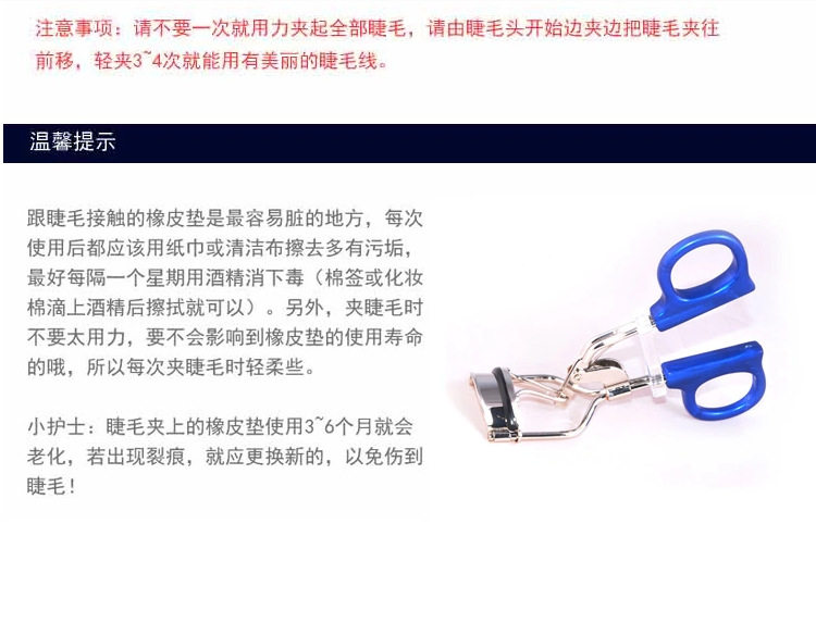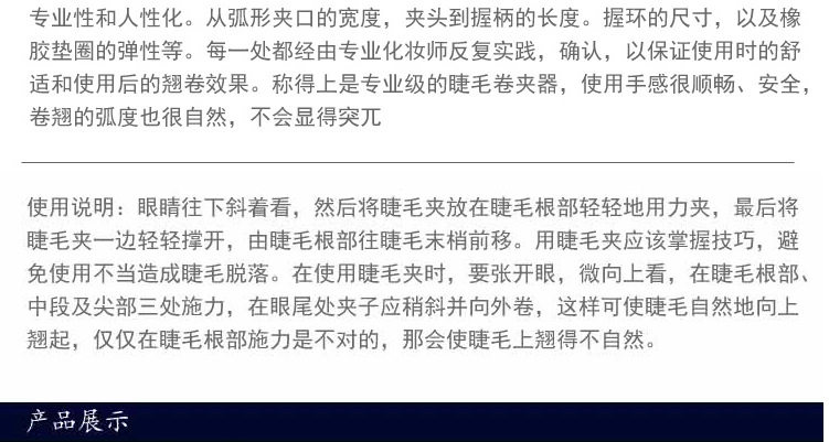 店主自用强烈推荐~~一直在用10元左右的普通睫毛夹,进货的时候也很顾虑这款是不是价格太高了,结果用后太惊讶了,贴肤度超吻合,而且不会夹到皮和扯到睫毛,轻松的在根部将睫毛夹弯.,就象kevin老师说的那样 只需要轻轻的一点力就可以夹的很弯,我是立刻把原来的睫毛夹给扔了~~ 嘿嘿~水水们 想化一个漂亮的睫毛 一个好的睫毛夹是非常重要的哦~ 这款睫毛夹绝对对得起这个价格哦~~~推荐!!!!!!