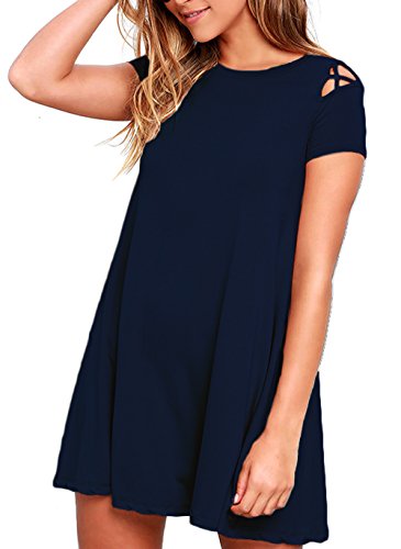 Features:Casual,Loose Fit.Cut Out Lattice Shoulder Detial,Short Sleeve A-Line Dress,Rounded Neckline,Short Mini Length,take shape in lightweight jersey knit,leaving the swing bodice to steal the show!