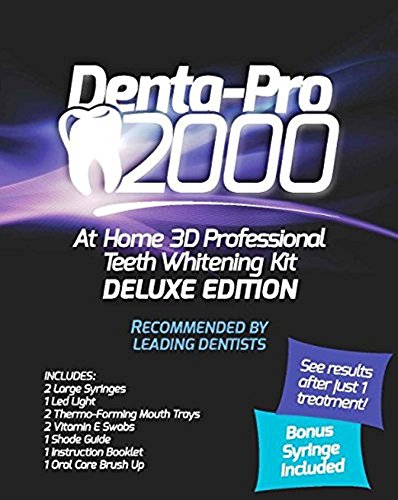 Want A Whiter Smile Without Costly Treatment? Denta-Pro 2000 Stay At Home 3-D Teeth Whitening Kit Deluxe Edition is definitely the way to go! It has the same dental-grade formula used by thousands of dentists across the US and Europe. Far more effective than other whitening options as this customized solution comes with trays that perfectly mold to your mouth, ensuring whitening exactly where you want it in the comfort of your own home! The same dental-grade Carbamide Peroxide that dentists use is included. Gel is enamel-safe.