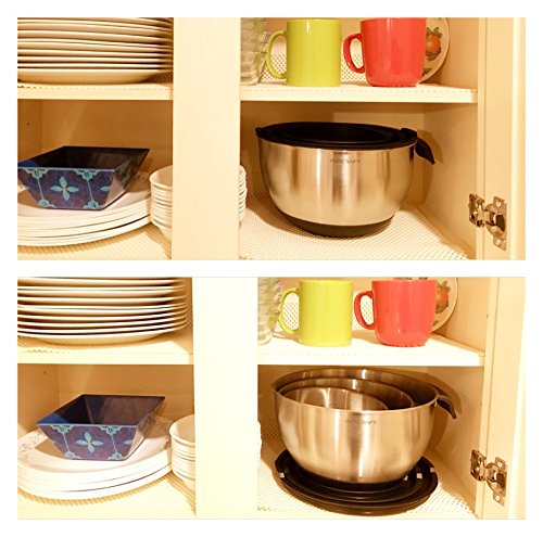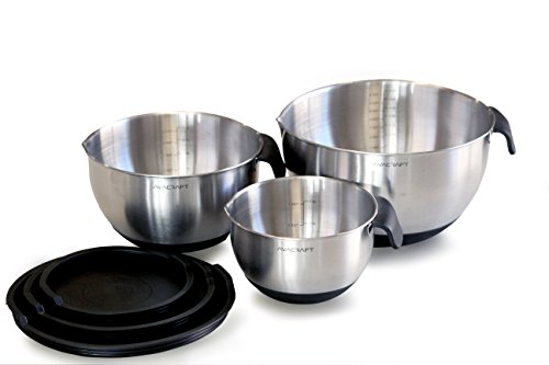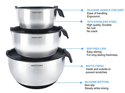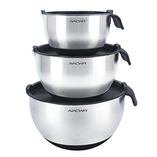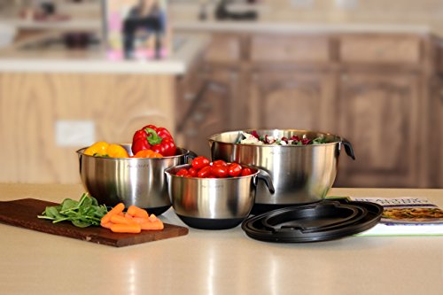 - SCRATCH-PROOF, 18/10 STAINLESS STEEL MIXING BOWLS: Includes set of 3 mixing bowls with lids; with convenient sizes 1.5 quart bowl with lid, 3 quart bowl with lid and 5 quart bowl with lid. Special matte finish inside to prevent scratches over time to keep the shiny steel look!