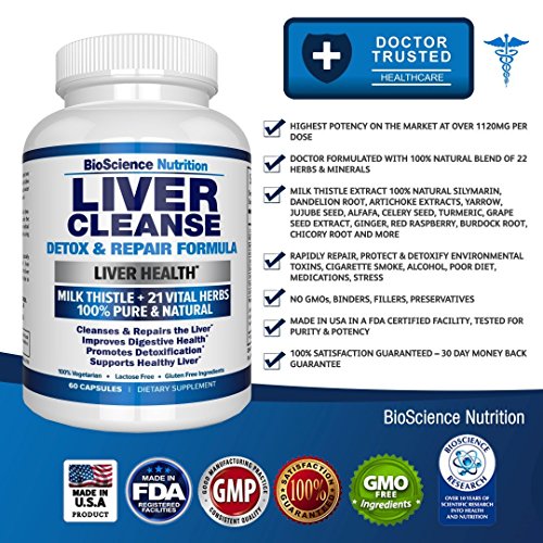 LIVER CLEANSE SUPPORT & DETOX SUPPLEMENT - 22 HERBS : MILK THISTLE EXTRACTS SILYMARIN, BEET, ARTICHOKE, DANDELION, CHICORY ROOT, WEIGHT LOSS AID HERBAL HEALTH SUPPLEMENTS - BIOSCIENCE NUTRITION USA